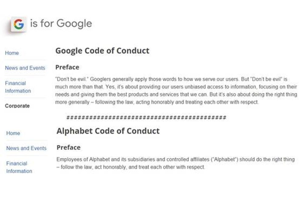 Häromdagen blev det klart att företaget Google numera är Alphabet som kommer inkludera diverse Google-relaterade företag.Googles motto för sina anställda, den så kallade "code of conduct" var "Don't be evil" vilket var den första radeen i deras uppförandekod för sina anställda men Alphabet har nu istället en ny uppförandekod och där verkar mottot vara "Do the right thing". Det är inte det första som står i den nya uppförandekoden men det finns åtminstone med på första raden, något som gjort att många tolkar detta som företagets nya motto.
