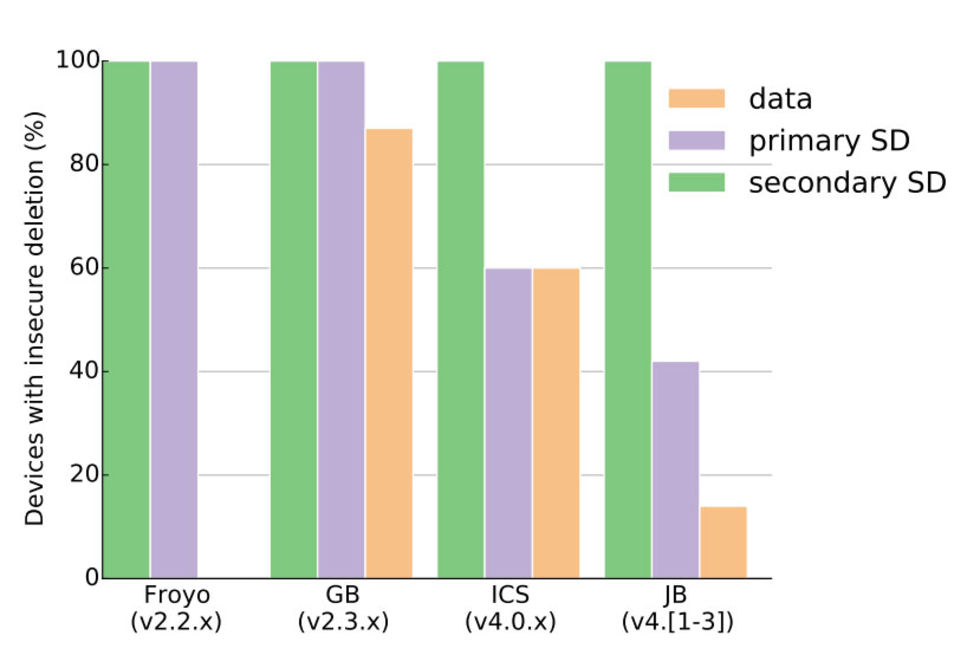 Forskare på Cambridge University har upptäckt att fabriksåterställningen i miljontals androidtelefoner inte fungerar som den ska och att det i många fall ska gå att återskapa den raderade datan, något som givetvis inte ska vara möjligt efter en fabriksåterställning.Forskar ha undersökt telefoner som kört Android 2.3 till 4.3 och i många av fallen kunde man återskapa datan både från telefonens interna lagringsminne men även från telefonens SD-kort som synes i tabellen nedan. Enligt forskarna ska detta även ha lyckats även om telefonen lagrar datan krypterad.Enligt forskarna så borde det att gå att återskapa datan från telefonens internlagring på runt 500 miljoner mobiler runt om i världen och från mobiltelefonens minneskort ska det gå att återskapa datan på runt 630 miljoner androidmobiler efter en fabriksåterställning.