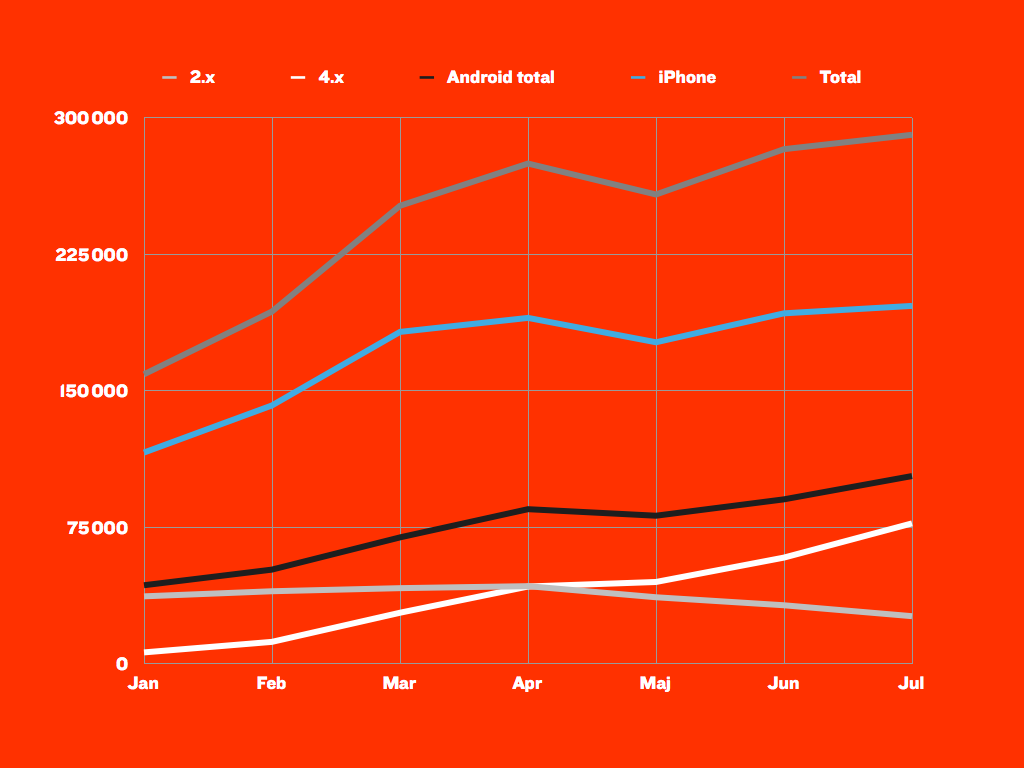Jag, och de flesta andra på Feber-redaktionen, har aldrig varit speciellt imponerade över gamla Android. Helt ok, men inte med den finish och skärpa man kan kräva. Speciellt webbupplevelsen under 2.x har varit flera steg efter den under iOS. Detta har också synts i statistiken, inte bara här på Feber, och Android har länge varit flera steg efter vad man borde ha om man tittar på försäljningsstatistiken.Men så kom Android 4, sakta men säkert. Väldigt sakta tyvärr eftersom det är en så trevlig uppdatering. Men nu rullar uppdateringarna och nya telefoner ut och fler och fler av er får ta del av ett betydligt vackrare OS och framförallt allt - en betydligt bättre webbupplevelse. Och det syns på statistiken som ni ser här. Av er som kör Android och surfar på Feber med din telefon har tre av fyra nu Android 4. Maj var en dålig månad för oss på Feber (då vi låg nere mycket) så därför är det en konstigt fall där för alla operativ. Som ni ser står 2.x relativt still fram till juni då siffrorna börjar vika, men totalen för Android fortsätter att öka. iPhone ökar också, men relativt sett mindre än tidigare. Ni Feberbesökare är ju först i ledet med att använda ny teknik så vi ligger nog före många andra siter i den här utvecklingen, men det känns som att Android äntligen kommer att användas för mobilsurf och att de flesta siter under hösten kommer att få se en fortsatt ökad mobiltrafik.Det vi har tittat på här är besök per månad från iPhone (alltså inte iOS totalt), Android 2.x och Android 4.x.