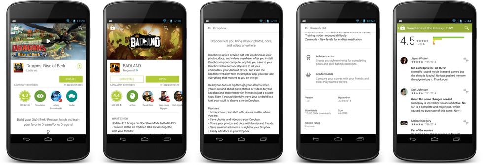 Google har börjat rulla ut en designuppdatering i Androids appbutik Google Play och på skärmdumparna här kan ni kolla in lite hur den mobila versionen av Google Play kommer att se ut.Google har använt sig av det så kallade "Material Design", ett formspråk som Google presenterade på årets upplaga av Google I/O förra månaden. Man har även lagt till lite nya grejer som till exempel att man kan se appar som ens Google+-kontakter har "plussat".Exakt när Google Play 4.9.13 kommer att landa i våra telefoner finns inga uppgifter om men skulle man vilja testa det redan nu så kan man ladda hem det här och installera manuellt.