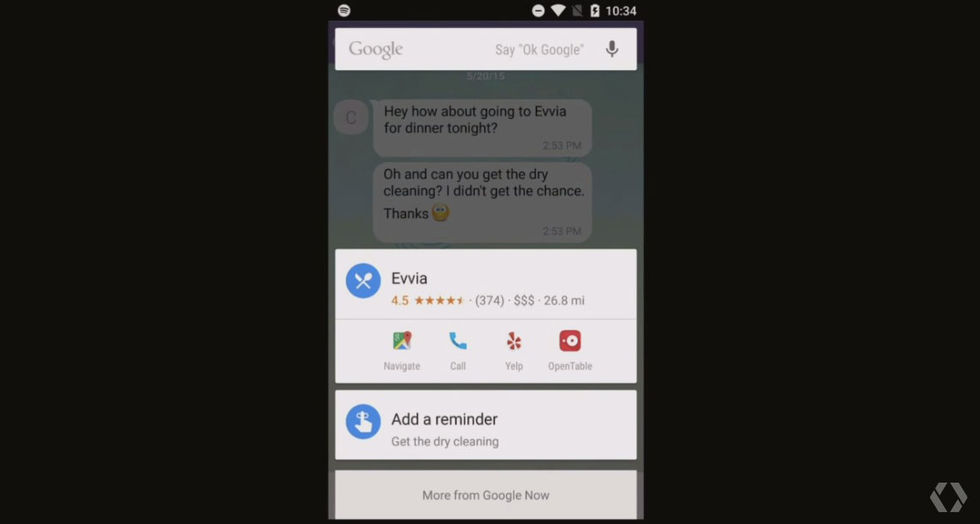 Under den pågående utvecklarkonferensen Google I/O visade Google upp en uppdaterad version av sin digitala assistent Google Now som kommer att släppas i samband med att Android M släpps senare i år.Google förklarade att Google Now fokuserar runt tre element varav det första är att känna till kontexten (Context) mobilen befinner sig, det vill säga till exempel att veta vad klockan är, var användaren befinner sig, vilken app som används och hitta eventuella mönster i det.Det andra är att kunna besvara frågor så korrekt så möjligt baserat på kontexten (Answers) och till sist ska Google Now även kunna rekommendera åtgärder som kan utföras baserat på den besvarade frågan (Actions).Man visade även upp något som man kallar för "Tap on now" vilket innebär att man hela tiden ska kunna nå Google Now utan att för den delen behöva lämna den appen man är i. Som exempel visade man när man spelade upp en Skrillex-låt på mobilen och utan att lämna appen kunde fråga Google Now vad Skrillex riktiga namn är.Ett annat exempel som visades upp var det på bilden nedan där man i direkt i ett textmeddelande kan få information om till exempel en restaurang, var denna ligger, meny och lägga till en påminnelse.