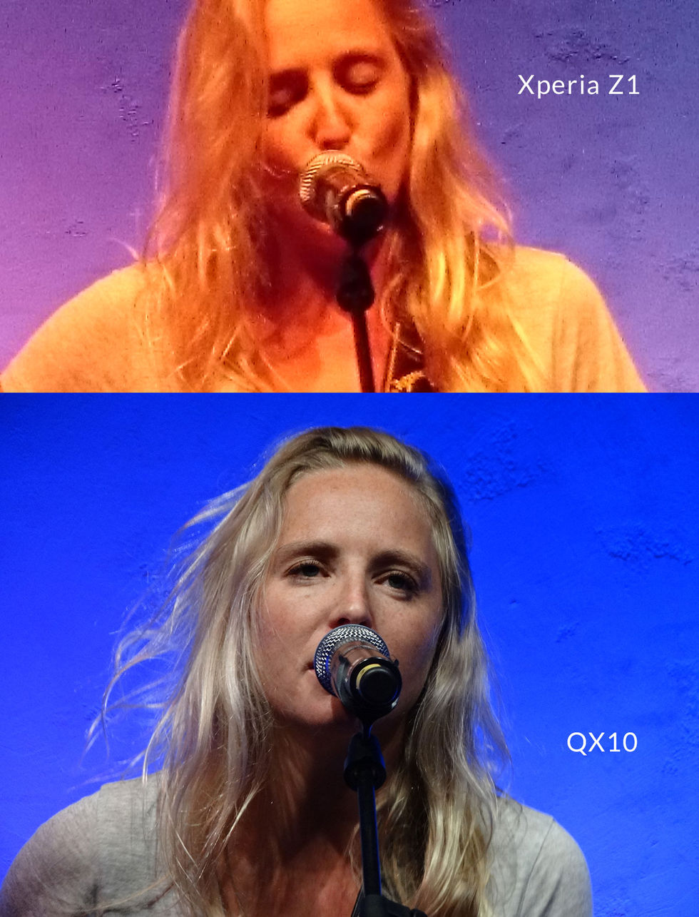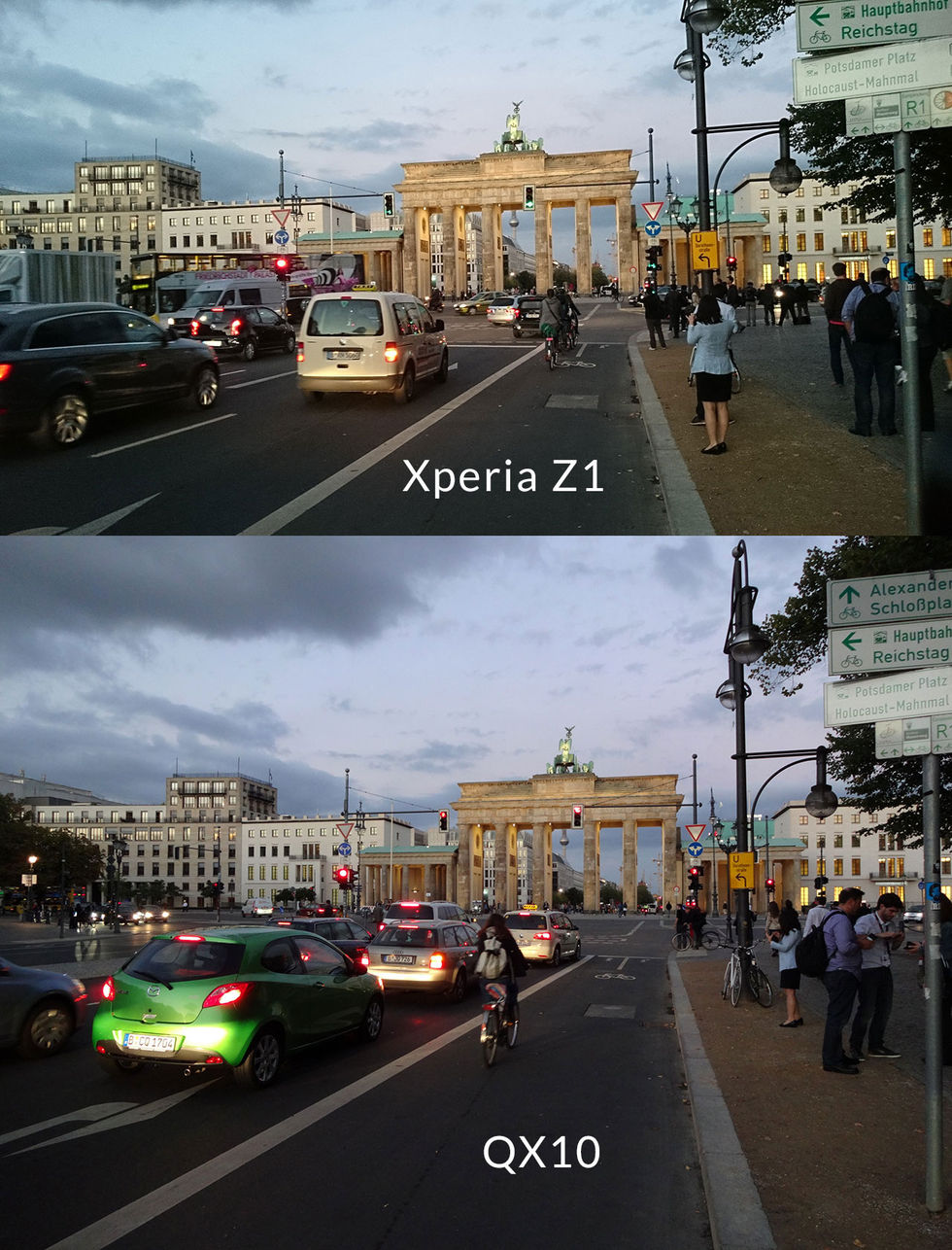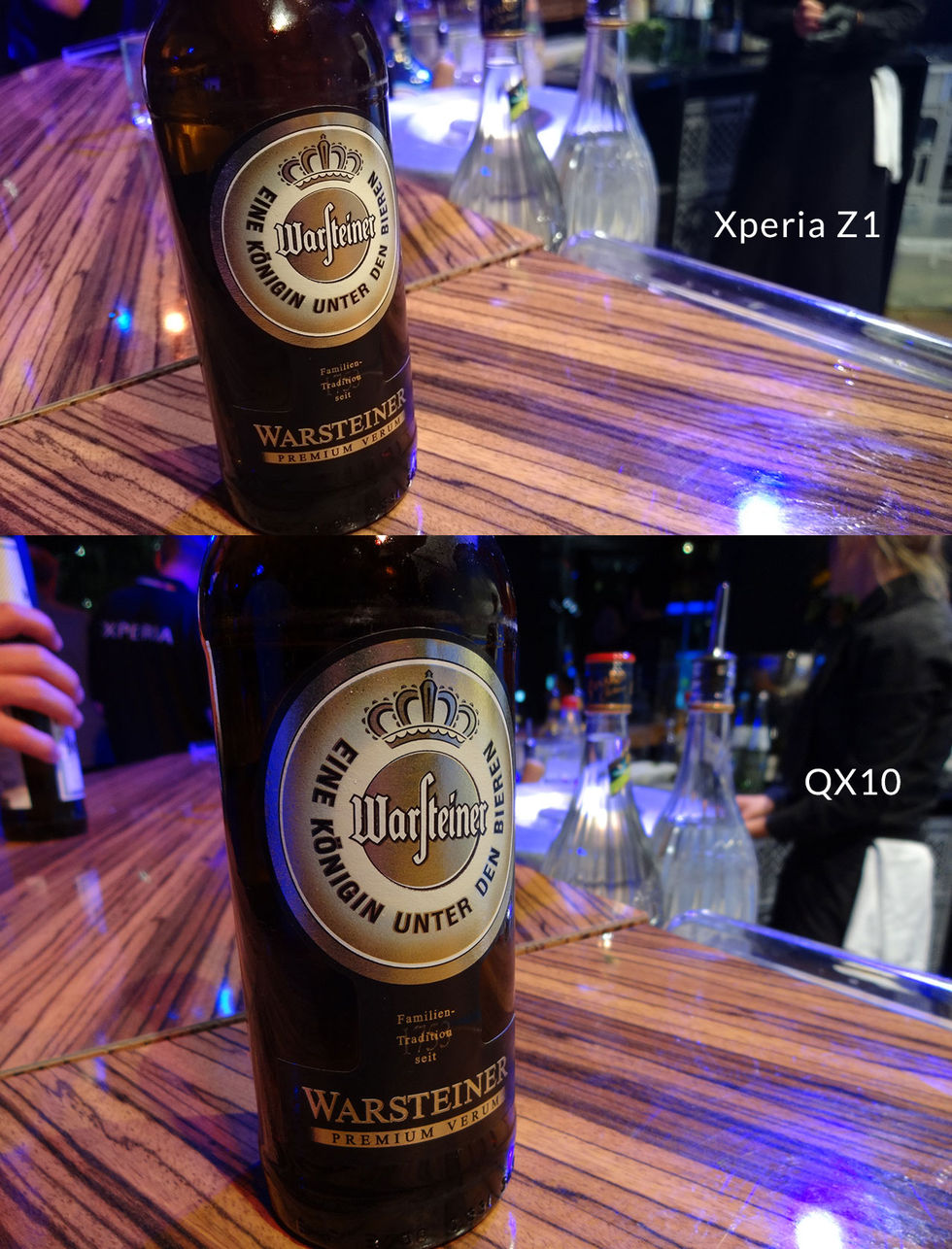 Vi har sedan igår testkört de två stora nyheterna från Sony: Nya toppluren Xperia Z1 och en av de två skärmlösa kamerorna - QX10. Lite mer om de två prylarna kommer senare men vi tänkte börja med att posta bilder. QX10 är den billigare varianten (2000 spänn) och vill man ha ännu bättre bilder får man köra QX100 (runt 3500 kronor). Sensorn i Z1 har blivit rejält större och är enligt Sony nu i samma storlek som "normala" kompaktkameror. Alltså helt ok, framförallt ljuskänsligheten är grym. Tar man bilder på kort avstånd så är skillnaderna mellan Z1 och QX10 inte så stora, som på den här ölflaskan. Ute på Berlins gator i skymningen presterar också båda prylarna bra tycker jag, här en bild på Brandenburger Tor.I mörka miljöer som den ovan på bandet ger båda bra resultat tycker jag, Z1:an mer brus. Men det är när man vill komma lite närmre som QX10:an verkligen levererar, att zooma med Z1:an går ju så klart men resultatet blir ju katastrof. Sony hade satt upp en liten låda i sin monter för att visa på skillnaden en större sensor gör på möjligheten att ta bra bilder i mörker. Först pekar vi in kameran från en Nexus 4, en klart medioker kamera, och det är helt svart. Sedan testar vi med Z1:an och som ni ser på filmen blir resultatet lite annorlunda...