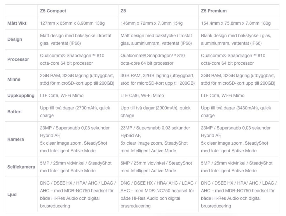 Sony avslutade precis sin presskonferens på IFA-mässan i Berlin och bland de nya grejerna man presenterade fanns nästa modell av Xperia, Xperia Z5.Xperia Z5 kommer i tre olika modeller, Xperia Z5, Xperia Z5 Compact samt Xperia Z5 Premium. Z5 har en 5,2 tum skärm, Compact har en skärm på 4,6 tum och Premium har en skärm på 5,5 tum vilket även ska vara världens första mobilskärm med 4K-upplösning enligt Sony.Samtliga modeller kör en åttakärnig Snapdragon 810-processor och Z5 Compact har 2GB RAM medan storebröderna är försedda med 3GB RAM. Alla tre har 32GB lagring vilket ska gå att utöka med ett microSD-kort till 200GB. Telefonerna är försedda med en kamera på 23 megapixel med 5x zoom och en selfiekamera på 5 megapixel.Xperia Z5 Compact släpps den här månaden med ett rekommenderat pris på 5.800 kronor, Xperia Z5 släpps i oktober och kommer att kosta 7.000 kronor medan Xperia Z5 Premium släpps i november och kommer att kosta 8.000 kronor.Nedan hittas telefonerna specifikationer lite mera utförligt.