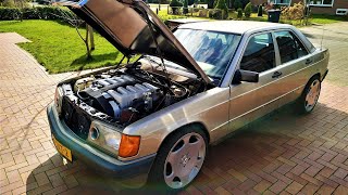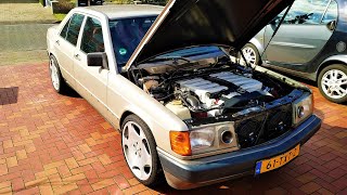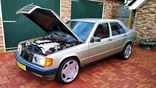En gammal Mercedes 190 som fått V12:an från 600 SEL