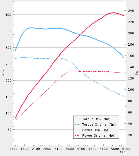 Det är inte helt ovanligt att företag stryper sina produkter på olika sätt för att förenkla produktion men samtidigt ge kunderna anledning att betala olika pris för olika effekt. Bilar är inget undantag, tvärtom. Volvo verkar vara duktiga på detta för deras så kallade VEA-motorer som drivs med bensin verkar vara en och samma motor, oavsett om det står T2, T3, T4 eller T5 på bakluckan. Med hjälp av olika mjukvara styr man effekten beroende på vad kunden har betalat. Skillnaden i effekt för kunden är rätt dramatisk, en T2:a har 122 hästkrafter och en T5 har 245 hästkrafter enligt Volvo. Men mjukvara är mjukvara och nu har BSR tagit fram en trimsats till dessa motorer som gör stor skillnad för effekten. Av naturliga skäl är skillnaden störst för de med T2-varianten, där går antalet hästkrafter från 122 (Volvos siffra) till 236, alltså nästan dubbelt så mycket. Tittar man på effektkurvan ser det ut så här: Som ni ser så dör kraften med originalmjukvaran runt 130 hästkrafter, men med nya mjukvaran fortsätter den upp till över 230 hästkrafter. Även vridmomentet ökar, från 269 till 360 Nm. Enligt BSR så ska tiden för att accelerera mellan 80 och 120 km/h falla från 8,17 sekunder till 4,03 sekunder. Trimsatsen kostar 6990 kronor om man lånar enheten för att föra över mjukvaran. Vill man köpa enheten kostar det 2000 kronor extra. Vid en service hos en Volvo-verkstad kan mjukvaran skrivas över, men det ska då gå att lägga in den igen. Enligt BSR ska mjukvaran inte skada motorn, men det får stå för dem. Mjukvaran går att lägga in på bilar efter 2015 och bilen måste ha manuell låda. Trimsatsen finns även för T3 och T4, men då T4 har 199 hästkrafter från början blir skillnaden "bara" 37 hästkrafter, så att lägga in detta känns kanske mest aktuellt på T2 och T3. Med tanke på att prisskillnaden på en V40 med T2 och T5 (som har 245 hästkrafter enligt Volvo) är 90.000 kronor kan det vara lockande att köpa en T2:a, köpa den här mjukvaran och använda de resterande 81.000 kronorna på extrautrustning.