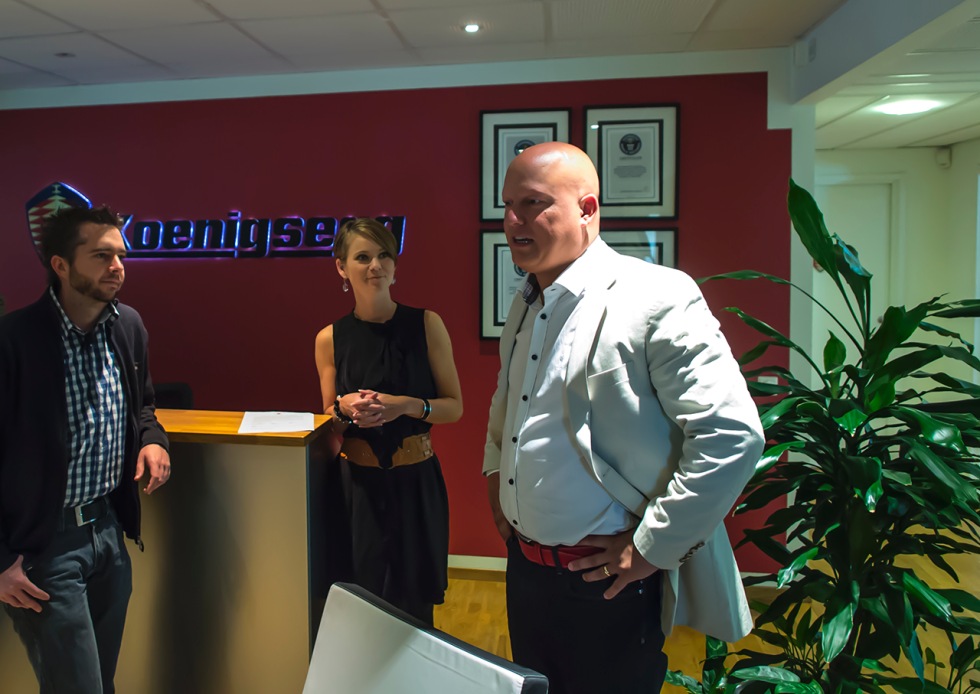 InledningDagen började med att Christian själv hälsade alla välkomna och därefter var det dags för mitt gäng att få en rundtur i fabriken av hans fru Halldora. Redan där märker man att det här verkligen är ett litet familjeföretag. Totalt jobbar det 45 personer hos Koenigsegg, alla handplockade och experter inom sina områden. De gamla hangarerna är charmiga och här finns inga avancerade superrobotar som sätter ihop bilarna, utan allt monteras för hand. En kille stod och skar ut kolfiberväv med en kniv som sedan skulle appliceras på olika delar, en annan satt i ett rum och sydde fast läder på rattar. Inget slamrande eller störande ljud någonstans, alla har sina uppgifter att sköta och det verkar också som att de gör det. Rent och snyggt överallt men man får samtidigt känslan av att det faktiskt jobbar folk här. Äta saker som tappats på golvet gör man hos McLaren, inte hos Koenigsegg om man säger så.Hårda faktaTotalt är arbetet med just bilen uppdelat på sju olika stationer. Där spenderar varje bil ungefär tre veckor innan det är dags att ta sig till nästa del i monteringen. När en bil påbörjas är den ju självklart beställd och då lägger köparen en deposition på 30 %. När bilen sen når station nummer fyra är det dags för ytterligare 30 % och efter 9-10 månader när bilen är klar hostar man upp resterande 40 %. Priset för en Agera R börjar på 1.5 miljoner dollar. Förra året såldes åtta stycken bilar och för tillfället har Koenigsegg lyckats bygga 97 stycken totalt.Motorn som verkligen är hjärtat i bilen monteras ihop av en enda person. Alla delar kommer till fabriken där de sedan sätts ihop och allt är specialtillverkat just för Koenigsegg. I Agera sitter det en V8:a på 5.0 liter med dubbla turbo som levererar 960 hästar och ett vrid på 1 100 Nm. 0-100 km/h går på tre sekunder, 0-200 på åtta, 0-200-0 på 13.5. Toppfart okänd. Till motorn sitter det en speciellt framtagen sjustegad låda med två steg i kopplingsfasen, inte som en dubbelkopplingslåda då den inte har dubbla kopplingar utan ett annat system som är minst lika kvickt, men lättare och kompaktare.Chassiet består av en i monocoque i kolfiber. Soppatankarna är integrerade i den här konstruktionen och totalvikten för hela rasket ligger på låga 70 kilo. Tjänstevikten ligger på 1 435 kilo.Nu är det dags att få åka med en sväng och se vad alla dessa siffror betyder i verkligheten!UpplevelseHerregud. Vilket as till bil. Efter att ha vikt in mig i cockpiten på passagerarplatsen (för en gångs skull) och fått lite hjälp med att spänna fast mig i fyrpunktsbältet av testföraren Robert Serwanski var det alltså dags. Rullande start och sedan fullgasacceleration. Som ni kan se i klippet ovan var det då inte helt enkelt att hålla kameran still. Ofantligt drag och även om varje växling var över på bara någon millisekund kändes varje som en boxning i bröstet, fast på ett härligt sätt. Väl uppe i lite fart stampade Robban på bromsen och släppte ratten. Bilen kändes trots detta sjukt stabil och fortsatte i en helt rak linje. Snygg uppvisning med andra ord.Efter åkturen pratade jag med Christian om hur mycket jag gillade att bilen kändes så levande. Den drar loss vid växlingarna och verkar verkligen ha en egen personlighet. Växlingarna är rätt brutala och den otroligt tajta, men ändå hyfsat rymliga kupén, gör att man känner sig som ett med bilen. Detaljfinishen är verkligen på topp, och på fabriksgolvet var det här något jag kunde syna extra då flera nakna chassien stod uppställda. Inget har lämnats åt slumpen och varenda pinal som sitter på bilen har en funktion. Det är verkligen ett mästerverk i bilbyggarkonst även under karossen. Mycket imponerande.På tillbakavägen utnyttjade vi hela flygfältet och svängde fram och tillbaka för att jag skulle få känna på greppet. Bilens aerodynamik hjälper ju självklart till att suga den fast mot marken men däcken är ju även viktiga, och det är där Michelin kommer in. Först testade vi i 160 km/h för att sedan öka till 180. Inga som helst problem och det kändes nästan som att vara ute på vilken söndagstur som helst. Koenigsegg har sedan starten valt att använda sig av däck från just Michelin då dessa helt enkelt fungerar bäst enligt Christian. Ett däck till en sån här bil måste klara av höga påfrestningar under lång tid, vilket enligt honom sulorna från Michelin gör. Jag kan verkligen inte ett skvatt om däck men visst greppade det något enormt under testrundan som vi som var där fick. Det blev rätt många rundor med hård acceleration, hård inbromsning och hårda manövrar, vilket inte verkade vara några som helst problem. Däcken som satt på bilen heter Michelin Pilot Super Sport i dimensionerna 265/35 R19 fram, 345/30 R20 bak. De är klassade för hastigheter över 420 km/h, men det här var som ni säkert förstår av förklarliga själv inget vi kunde testa på plats. Det här är likadana däck som satt på när rekordrundan 0-300-0 km/h på 21.19 sekunder sattes.IntryckGenomgången av alla stationer i fabriken var mycket intressant och även om det mesta fanns där i bakhuvudet efter att ha tittat på mängder av dokumentärer och läst artiklar om Koenigsegg var det kul att få höra det av Halldora själv som verkligen verkar älska sitt jobb. Tillsammans med Christian har hon skapat något alldeles eget som de kan stå bakom till 100 % och som de mer än gärna delar med sig av. Det är kul att höra hur de kämpat från idéer till skisser till färdiga produkter som faktiskt säljer, om än i en liten skara. Oerhört inspirerande. Halldora, Christian och de andra som jobbar hos Koenigsegg verkar ha en skön sammanhållning och stämningen på fabriken kändes skön.Det var en del som skämtsamt sa att de nu skulle hem och börja spara pengar för att en dag kunna ha råd att köpa en Koenigsegg. Jag är inte riktigt i