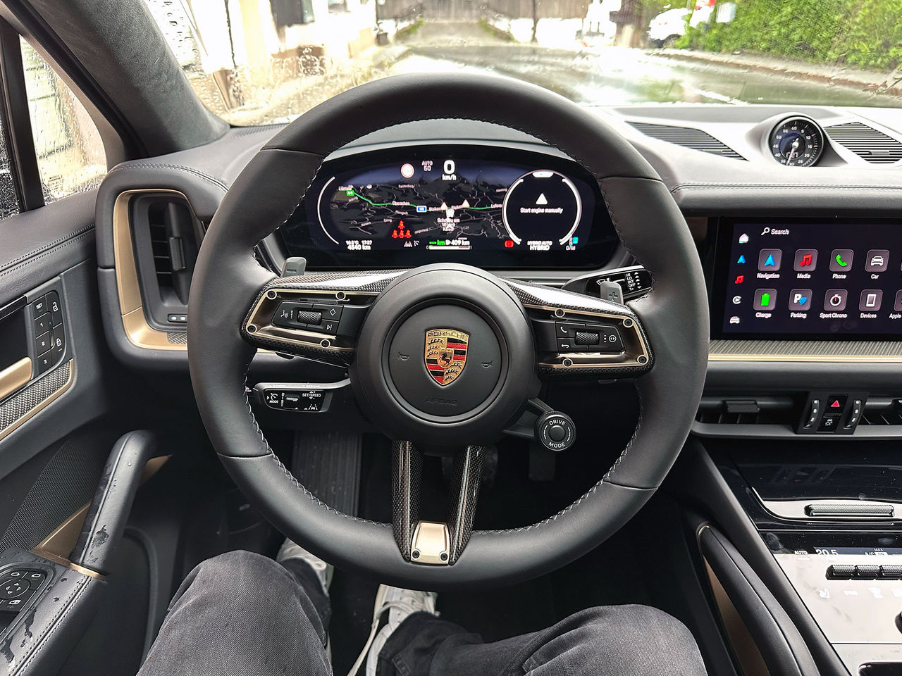 Tidigare generationer av Cayenne har likt Panamera haft en mittkonsol värdigt ett mindre flygplan. Charmigt och mäktigt. Nu hämtar man istället upplägget från Taycan och det är digitala knappar som gäller. Men inte för allt, klimatanläggning och volym har man som fysiska knappar, mer om det senare. Men vi börjar från vänster.Nyckel har blivit startknappEn Porsche har nyckeln till vänster om ratten, inte till höger på många av sina modeller. Så är det och så ska det alltid vara och det är mycket tillfredställande av någon anledning. Kanske mest beroende på vad som händer när man vrider runt nyckeln Problemet är att nu för tiden behöver man inte peta in en fysisk nyckel i ett hål för att starta bilen. Tidigare har man på Cayenne haft en "startknapp" som sett ut som en nyckel som man tryckt in i ett hål, om ni fattar, och att man vridit runt denna. Inte riktigt lika tillfredställande, men tillfredställande. På Taycan blev detta istället till en startknapp, att vrida runt en nyckel i en elbil blev bara fånigt. Nu är det samma sak för Cayenne men man har lyckats göra den ännu tråkigare än i Taycan. Supertrist faktiskt. Dåligt Porsche! Ratt hämtad från 911Sen kommer vi till ratten och här är det bara trevligheter. Ratten är nämligen hämtad nästan direkt från 911 och det är ju väldigt trevligt. Man styr enkelt musik och skärmar till höger och vänster på ratten och Sport-läget knuffar man snabbt och enkelt i genom det lilla vredet. Gillar denna extremt mycket av någon anledning. Skärmen i Taycan är bredare och bättre placerad......än i Cayenne där den känns intrycktVisst känns det inte rätt?Skärmen framför föraren är, nästan, hämtad från Taycan. Nästan säger jag eftersom den har samma look men inte är alls lika bred. Först tänkte jag att det hade någon bra anledning, men när jag tittar på hur skärmen är placerad i Taycan vs Cayenne ser man tydligt att inredningen i Cayenne inte alls är gjord för den där skärmen egentligen. Känslan när man sitter i bilen är inte alls billig eller tafflig, men lösningen är lite udda. Eller udda, det är en facelift-lösning helt enkelt. Man har velat ha den nya skärmen i bilen men det har inte varit läge att göra om hela instrumentpanelen för det, vilket jag förstår. Börjar man pilla med sådant måste man göra om en herrans massa saker och det kostar mer än det smakar. Vi får helt enkelt hoppas att helt elektriska Cayenne (och Macan innan dess) har en bättre lösning lik Taycan, de bilarna bygger på en ny plattform så där finns inte begränsningen. Klart är iallafall att detta är en kompromiss. En fungerande kompromiss, men en kompromiss. Färggladare än tidigareVandrar vi till mitten av inredningen så hittar vi den stora skärmen och systemet här är helt ok. Det gör sin sak, det fungerar och det är rätt tydligt och enkelt. Det har blivit färggladare än tidigare versioner och jag vet inte vad jag tycker om det egentligen. Färg är bra eftersom det gör att hjärnan snabbare vet vilken ikon som fingret ska trycka på, men det har varit något rent och snyggt över de stilrena ikonerna som man haft tidigare. Och så mycket är man inte där och pillar.