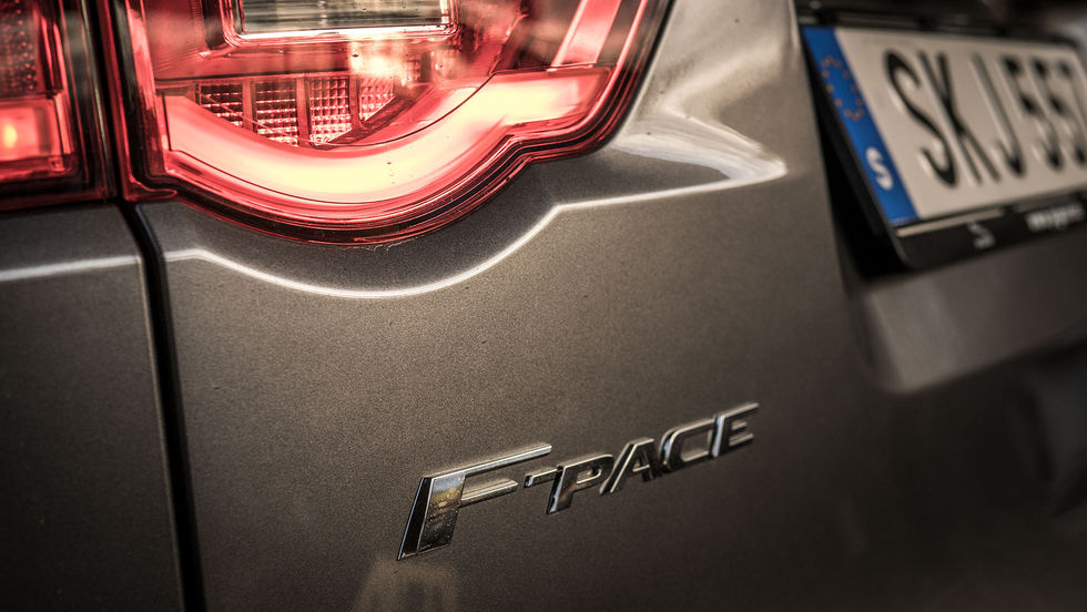 Bilen driver mestadels på bakhjulen, framhjulen kopplas in när de behövs och i den mån något hjul behöver lite extra kraft. Land Rover som ligger bakom systemet vet vad de pysslar med och bilen går tryggt och stabilt på vägen, och kan utan större problem tackla hinder där det inte finns så mycket vägar. Där körde jag aldrig med bilen, utan det blev mestadels landsväg. Det största hindret var nog när bilderna skulle tas, och det var som ni ser inte särskilt utmanande. Markfrigången på 23 centimeter var mer än tillräcklig här. Kollegor försäkrar dock att bilen klarar mer än att tugga asfalt, och att den faktiskt sköter sig riktigt bra ute i terrängen. Men det är ju inte där den kommer att härja omkring, tyvärr. Utan det blir på motorvägen, i stan och utanför den pråliga villan i den exklusiva förorten.Visst väckte modellen lite uppmärksamhet när jag var ute och körde, en person stannade till och med och frågade om han fick fota den, men ganska snabbt så smälter den ändå in bland alla andra premiumsuvar som snurrar runt på gatorna. F-Pace blir snabbt en i gänget och jag kom flera gånger på mig själv med att undra varför man skulle köpa just denna. Att Jaguar måste ha en SUV i sitt utbud förstår jag, men den bjuder liksom inte direkt på något spektakulärt som konkurrenterna inte redan har. Det blir också tydligt efter några dagar av motorknatter att det här med förbränningsmotorer inte är så kul i en stor bil. I en liten och rapp sportbil kommer jag alltid att tycka att det är kul med ylande och vrålande maskiner, men i bilar som man endast ska transportera sig i känns det verkligen gammalt. Eldriften med allt vad den innebär är inte riktigt där än för att den konventionella motorn ska kunna ersättas men när det väl sker kommer det nog att vara skönt. F-Pace kommer ju högst troligt att fungera som en vardagsbil för köparen och inte som sportbilen man plockar ut på söndagarna, och då vore det ju himla härligt om den hade minimalt med underhåll och gick tyst och fint - som en elbil. Elbilen I-Pace är på väg så det kommer, men tills dess får vi nöja oss med traktorbuller från huven, oljebyten och kamkedjor/remmar som måste bytas.Exteriör Snygg för att vara en SUV. Kan man säga så? Det är nog det som i mina ögon bäst beskriver F-Pace. Det är svårt att få till några vackra linjer när man har så här mycket plåt att jobba med men jag tycker ändå att de har fått till det någorlunda. Kommande I-Pace är dock snäppet vassare, men den har ju även en annan taklinje att jobba med. På traditionellt Jaguar-vis dominerar grillen i fronten medan strålkastarna är ganska så slimmade. Den ser maffig ut framifrån. Baktill har man som vi kan se försökt att få till något F-Type-liknande men inte riktigt lyckats ta sig hela vägen fram. F-Type ser rätt så aggressiv ut bakifrån, F-Pace har nästan ett lite ledset uttryck. Överlag fungerar allt dock helt okej tillsammans. Som vanligt kräver en bil av den här kalibern stora hjul för att det inte ska se helt tomt ut i hörnen, men det är samtidigt fel eftersom man helst inte vill köra ut bland stockar och sten med 22-tummare. Om nu någon någonsin får för sig att göra detta vill säga.Interiör Här känner den som är van vid Jaguar och Range Rover garanterat igen sig. Knapparna för elhissarna som är placerade ovanpå dörren kommer direkt från Rover-hållet, medan resten av interiören återfinns i alla övriga Jaguarer, i synnerhet XE. Det klassiska vredet för växelväljaren som snyggt kommer upp ur panelen finns såklart på plats, precis som den silvriga startknappen man vevar igång allt på. Den treekrade ratten känns sportig och visst är det alltid trevligt när ett hoppande kattdjur pryder den. Klockorna i instrumenteringen är digitala och visar det som behöver visas på ett tydligt och ganska så snyggt sätt. Matar man in det sportigaste "Dynamic"-läget blir dessa ilsket röda och man blir snabbt varse om att det bilen har hoppat in i sitt värstingläge. I övrigt har man en pekskärm på mittkonsolen att leka med. Den är för en gångs skull inte bedrövlig att jobba med som tidigare har varit fallet i Jaguar, även om de har snäppt upp sig de senaste åren. Skärmen reagerar snabbt, den är tydlig och det är inte massa krimskrams-animationer som stör upplevelsen. Testbilen var utrustad med ljus skinnklädsel. Det är jättefint att titta på, fast bara i ungefär tre sekunder. Speciellt om man kör på vintertid och inte är ensam i bilen. Baksätet bjuder på helt okej benutrymme men den sluttande takdesignen gör som väntat att man tappar lite i huvudhöjd. När man ska kliva in möts man också av massa trist plast vid insteget vilket drar ner intrycket en hel del. Framtill sitter man riktigt bra och bekvämt.Avslutning Det här med frånpriser är alltid lite kul. En F-Pace kostar från 423 900 kronor. Väldigt mycket pengar redan där, men det är busenkelt att få den siffran att fullkomligt balla ur. Testbilen som var försedd med den stora dieselmotorn kostar från 656 900 kronor och nu börjar det att bli riktigt svettigt. Lägger man då till att den var extrautrustad för, håll i er nu, 274 500 kronor, så landar slutsumman på 931 400 kronor! För att lägga den slanten känns det som att man verkligen måste ha bestämt sig för att man inte ska ha en Porsche Macan eftersom grannen har det.För att få känslan av Jaguar i F-Pace måste man nog slå till på den bensindrivna och kompressormatade V6:an med 380 hästar. Det är samma maskin som sitter i F-Type S och den är riktigt trevlig. En SUV med massa motor och häftigt ljud är inte vettigt någonstans, men det blir roligare. Det är även en SVR-version av F-Pace på gång som troligtvis blir ganska så hårig. Då kommer nog Jaguaren i modellen fram på riktigt. Väljer du någon av dieselmotorerna nu så får du en trevlig bil med sk