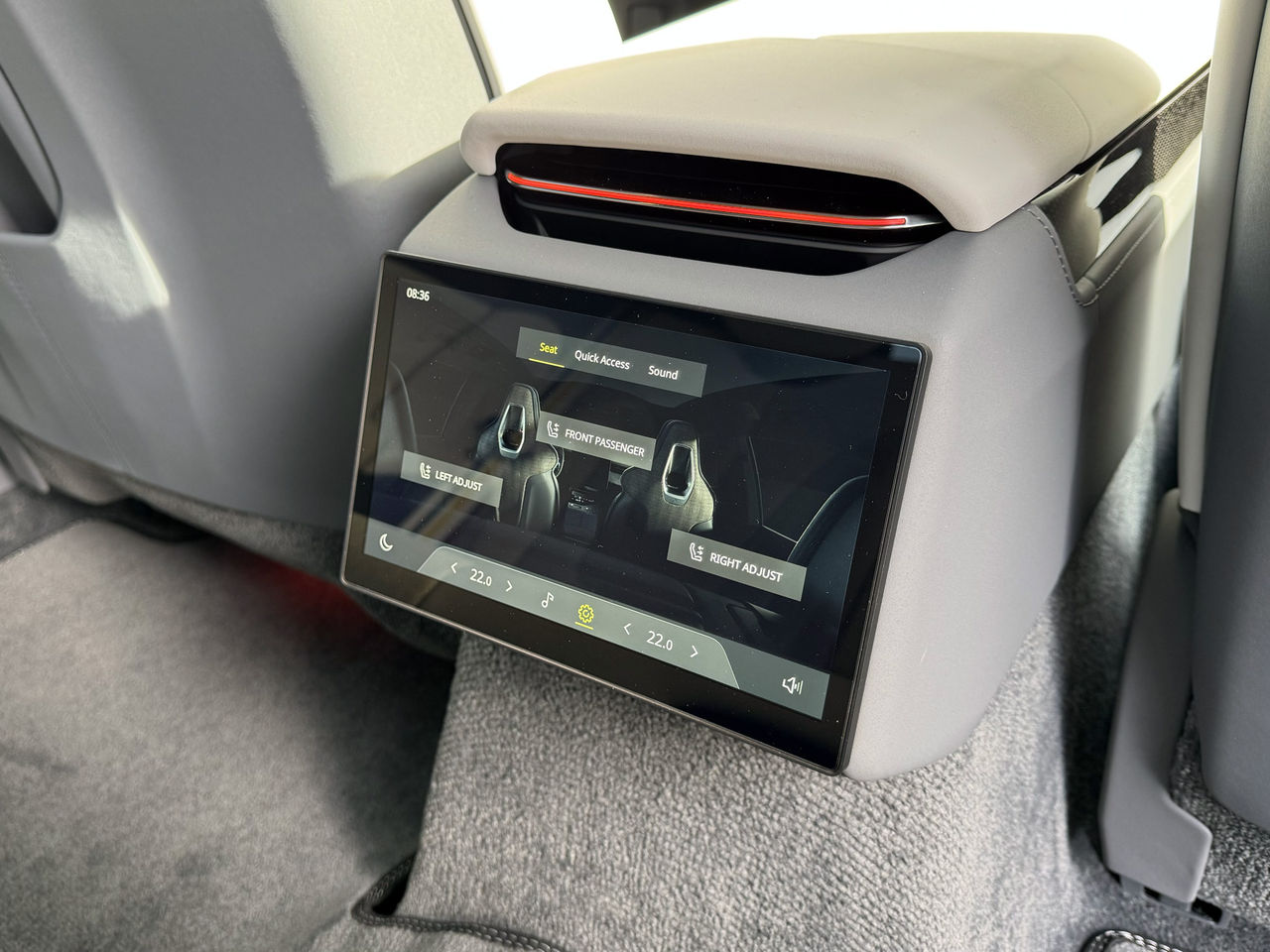 Ett baksäte har ju oftast plats för tre, men i Emeya kan man välja att bara ha plats för två. Om man väljer det alternativet så får de två som sitter där bak det betydligt lyxigare, vi snackar limokänsla deluxe. En trevlig bonus blir också att man i mellanrummet mellan passagerarna även får plats med en gigantisk subwoofer. Ett riktigt as till subwoofer faktiskt. Och med den tas ljudsystemet till en ännu högre nivå. Systemet har stöd för stöd för Dolby Atmos både för musik och video och när man drar på en videodemo låter det smått magiskt. Hade jag haft samma sak hemma hade mina grannar fått ringa störningsjouren. Men även med tre säten känns det helt ok lyxigt här bak. Skärmen i baksätet gör att man kan styra ljud och temperatur utan att behöva prata med de där framme.