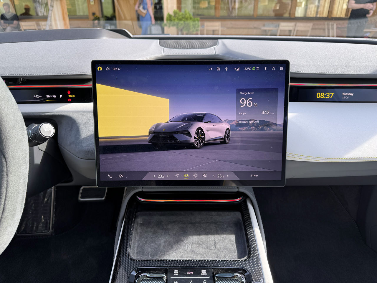 Det här är som sagt inte en bil för den anonyme, och det märks även på insidan. En del varianter har en mellangrå som jag inte föll för, men annars är det riktigt fint. Det finns en stor skärm i mitten, men ratten är fylld med riktiga knappar och vred. Tanken är att allt man behöver när man kör ska man kunna ställa in med fysiska knappar. På ratten finns det två olika paddlar där varje paddel har två lägen. Till vänster har vi regen, alltså hur mycket bilen ska motorbromsa. Detta går att ställa in i fyra olika steg. Tyvärr är dessa alldeles för lika varandra och det hårdaste läget är alldeles för tamt. Jag gillar bilar där man kan ställa in riktigt stark regenerering och använda det i sin körning, här är det alldeles, alldeles för vekt. Tyvärr. På den andra paddeln har vi körlägen. Comfort heter på Lotus-språk Tour och S är läget man väljer om man vill få lite fart på styrning och annat. På R-versionen finns även ett Track-läge, då stängs lite ESP och sånt också av. Med över 900 hästar används detta med försiktighet. Det finns tre olika skärmar där framme. Skärmen framför föraren är väldigt smal men har det mesta man vill ha i form av hastighet, räckvidd och sånt. En exakt likadan skärm sitter framför passageraren, men på den finns istället information om vilken musik som spelas. Snyggt och trevligt. Skärmen framför föraren fungerar som sagt helt ok, men jag saknar att kunna ha en karta på denna. Systemet på den stora skärmen går nämligen från höga poäng eftersom man inte kan göra två saker samtidigt. Drar man till exempel upp inställningarna så görs det över hela skärmen. Det är snyggt och smidigt, men kartan försvinner och det är frustrerande. Mjukvaran var, som jag berättade om tidigare, inte helt klar när jag körde Eletre. Nu är den betydligt mycket bättre. Perfekt skulle jag väl inte säga, men tillräckligt bra för att matcha resten av bilen.