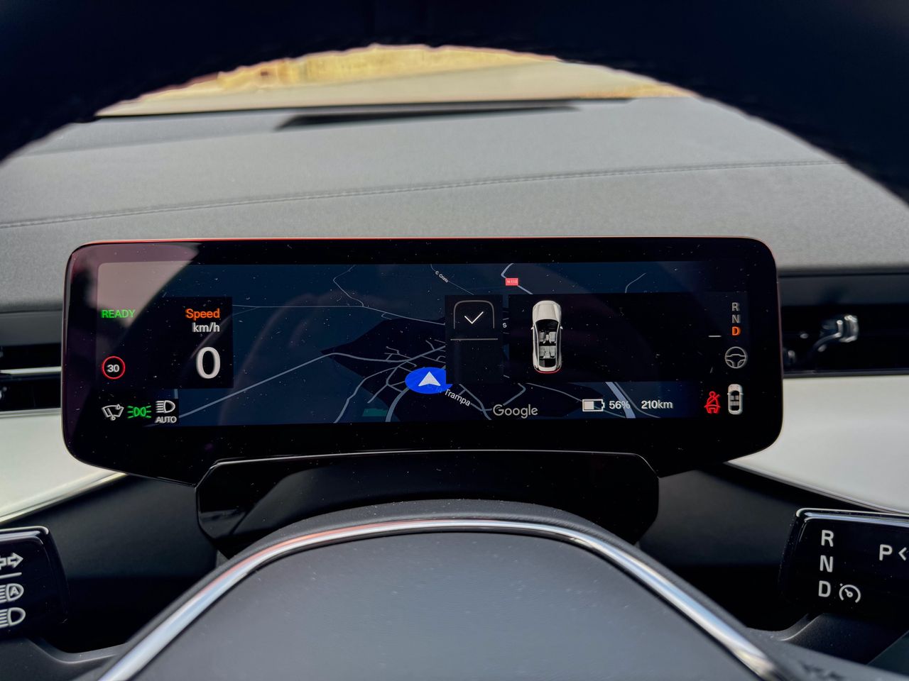 Framför föraren finns en liten skärm som jag gillar. Jag gillar ju den här typen av mindre skärmar som innehåller det som behövs och inte så mycket mer. Det är möjligen lite väl plottrigt på just denna, men det fungerar. Här får man hastighet, karta, ser vilken som är den lagliga hastigheten och så ser man status på Pilot Assist, alltså den funktion som hjälper till att köra. I Polestar 3 syns den hela tiden, vilket är bra, i Polestar 4 har man valt att gömma denna när den inte är igång, vilket är dåligt. Det är olika system i bilarna, men att man gör olika är ändå underligt.
