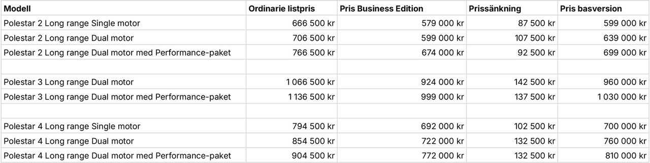 Polestar har sålt 5000 bilar i Sverige hittills i år, men det verkar inte som att försäljningen har tagit fart på det sätt man har hoppats på. 3771 av de där 5000 bilarna är nämligen Polestar 2, man har bara sålt 478 stycken Polestar 3 och 758 stycken Polestar 4. Nu sänker man priserna rejält, eller så ger man bort utrustning gratis. Hur man nu väljer att se på det. För nu lanserar man så kallade Business Edition av alla tre modellerna man säljer.I dessa ingår typ allt. För alla modeller ingår både Plus- och Pilot-paketen och för Polestar 2 ingår även Climate-paketet. Du får alltså med allt du behöver men betalar oftast lägre pris än för instegsmodellen. Nya priser ger nya förmånsvärden och blir då också attraktivare för företagskunderna, men priserna gäller även för privatkunder. Priserna gäller endast för lagerbilar men verkar bli mer eller mindre konstanta, erbjudandet gäller fram till sista juni nästa år. Det är såklart tråkigt att Polestar inte får de pengar de vill ha för sina modeller. Men för köparna är detta underbart, för Polestar har lagt med rätt basala saker i sina paket, så man vill ha de där paketen om man köper en Polestar. Men tidigare har priserna skenat iväg när man kryssat i paketen.