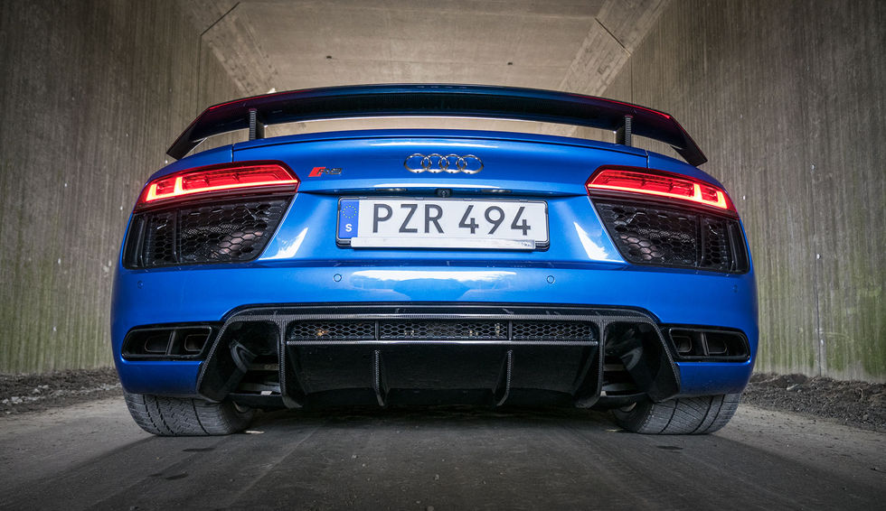 Försnack Råttan har alltid varit den där hyfsat diskreta superbilen som folk inte tittar riktigt lika snett på som andra bilar i samma kategori. Det är mer okej att köra omkring i en R8 än i en skrikig Ferrari. Och så kanske det blir när en vanlig biltillverkare även har en ordentlig sportbil i utbudet - det finns även vettiga modeller i modellfloran och man kikar på värstingen i bilhallen men åker hem i en dieseldriven A4. Så är det nog för de allra flesta, men några går hela vägen och köper det dyraste som står där. För pengarna får man något vars enda vettiga funktion är att kunna transportera två människor någonstans. Du kommer knappt att få med dig något bagage, du kommer att få träsmak i rumpan, du kommer nästan inte att kunna köra på vägar som inte är helt nyasfalterade och du kommer att grina varje gång du måste stanna och tanka - vilket är läskigt ofta. Men du kommer att ha riktigt kul på vägen, och du kommer att köra något av det värsta som finns att tillgå idag.Körkänsla Att hoppa in i en ny superbil är alltid en väldigt speciell känsla. Direkt märker man att det inte har sparats på någonting, och det ska det inte heller göras i en sån här typ av bil. Allt är åt det extrema hållet om man jämför med en vanlig bil av den sportigare typen. Man sitter alltid med ändan i backen, helst i aggressiva stolar. Man har oftast kass bakåtsikt, dålig koll på bilens alla hörn och en jäkla respekt för vad som ska hända när man vrider om nyckeln eller trycker på startknappen. Samma gäller i nya R8, men som alltid vänjer man sig ganska så snabbt. Startar gör man numera via en knapp på ratten och ett tryck på den leder till ungefär en sekunds väntan och sen ett jättebröl som får arga tanter att bli ännu argare och glada motorintresserade personer att bli ännu gladare. Det välbekanta V10-ljudet sprider sig likt varm nyponsoppa i kroppen och var man tveksam på att den aggressiva ut- och insidan inte skulle matcha det som sitter bakom nacken får man bekräftat att det visst är så ganska omgående. Till spisen sitter den sjustegade dubbelkopplingslådan som hade premiär i slutet på föregångaren och som även sitter i Huracán. Hästlängder bättre än den gamla sexstegade R-Tronic-lådan som om man inte körde den hårt fick en att tro att man tankat kängurubensin. Kökörning med denna låda är inget för känsliga. Annat är det alltså nu med en låda som har dubbla kopplingar och sju steg. Manuell låda är kanske lite roligare, men det går tyvärr inte att få här. Vill man växla manuellt går det dock finfint via paddlar bakom ratten eller med växelväljaren. Dock har Audi, fortfarande, inte lärt sig åt vilket håll man ska föra spaken för att växla upp och ner. Precis som i tidigare R8:or måste man här alltså föra spaken framåt för att växla upp, bakåt för att växla ned. Helt fel och en sak man stör sig på. När man väl har slutat att vara vansinnig över detta inser man att det, som i de flesta fall, är bättre att den smarta elektroniken får jobba ostört utan inverkan från förare.Lådan har jag tidigare provkört och fann den då vara ett trevligt lyft mot den något bråkiga R-Tronicen så jag hade inte väntat mig något annat än samma upplevelse även här. Dock är det inte en helt silkeslen upplevelse man bjuds på, i alla fall inte när bilen är kall. Att smyga iväg försiktigt går hyfsat men i låga hastigheter ligger den gärna kvar på ettan lite för länge, trots att inget sportläge eller liknande är aktiverat. Det blir dessutom lite väl ryckigt när väl tvåan läggs i och det är man ju inte så van vid med dubbelkopplingslådor. Med lite temp i både maskin och låda blir det bättre, men innan dess är det som sagt fortfarande lite hoppigt. Inget av detta märks när man börjar få upp hastighet utan det är endast i låg fart det blir påtagligt.Väl ute i trafiken märker man snabbt hur fläskig bilen är. Nästan två meter i bredd skojar man inte bort i första taget och vid tajta partier håller man andan för att få plats. Att hamna utanför asfaltskanten på högersidan vill man ju såklart inte, men ofta får man ligga på gränsen för att inte vänster backspegel ska hångla upp spegeln på den bil man möter. Det gäller att hålla tungan rätt i mun alltså. Den ganska stora vindrutan gör dock att man ser ganska bra, framåt i alla fall. Bakåtsikten lämnar som väntat lite mer att önska, men sensorer och kamera hjälper i alla fall till när det är dags att backa.Om man lämnar bilen i Comfort-läget och inte trycker på avgasljudsknappen blir åkturen faktiskt hyfsat bekväm. Växlarna byts utan att man märker av det, fjädring och dämpare gör så gott de kan för att maskera de stora hjulen och det faktum att markfrigången är minimal och motorn gör faktiskt inte så mycket väsen av sig. Man kan utan problem sitta och hålla ett samtal i normal ton och det kommer inte in så farligt mycket vägbuller i kupén. Men ivrig som jag är går det ju inte att låta bli att pilla på alla roliga knappar som finns, och då händer det grejer vill jag lova.Bilens humör styr man nu via ratten och en ny knapp med en flagga har tillkommit. Drive select innebär som tidigare att man kan stega mellan komfort, automat, dynamisk och individuell. Flaggan aktiverar dock ytterligare ett prestandaläge med tre olika lägen (dry, wet, och snow) som vässar till bilen ännu mer och som samtidigt öppnar upp stabiliseringssystemet ESC och tillåter föraren att leka lite mer. Drive select testade jag en gång, men annars var det mest flaggan som gällde. Från den där snälla och lugna åkturen till ett vårdslöst drag som är helt omöjligt att utnyttja fullt ut på allmänna vägar. 0-100 km/h på 3,2 sekunder gör att man även som förare måste hålla i sig när gaspedalen pressas ned. Löjligt snabbt och vetskapen om att det ändå