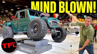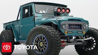 Det är SEMA-mässa i Las Vegas just nu och Internet väller över av knasiga byggen. Vissa är just bara knasiga, medan andra är rätt så balla och sticker ut lite. Här har vi en sistnämnd. Toyotas modell Land Cruiser ska återigen börja säljas i USA och för att fira detta har tillverkaren tagit fram konceptet FJ Bruiser som flörtar med generationen som släpptes på 60-talet. Och resultatet kan kanske misstas för att bara vara en radiostyrd bil eftersom den har så enorma hjul, men det är faktiskt ett riktigt bygge. Och man har inte snålat på grejerna. Under huven sitter det exempelvis en Nascar-V8:a som pumpar ur sig 725 hästar. Till den sitter en trestegad automatlåda som i sin tur driver alla fyra hjulen. Sen har hela chassit byggts om för att klara riktigt tuffa tag i terrängen och markfrigången skvallrar om att den här nog inte har några problem att ta sig över stockar och sten. Och skulle det ändå bli problem så har man monterat ett larvband under bilen så att man kan kräla av stenen eller vad det nu är man har fastnat på. Larvigt? Nä, fränt!"Every year we are fortunate enough to get to build a SEMA special project vehicle. With the return of the Land Cruiser to the U.S. Market, it only made sense to build a rock crawler, so this is our take on a 1966 Toyota FJ45 Pickup Truck. At first it was referred to loosely as ‘The Unstoppable FJ,’ but by the time it was done, it was a beastly vehicle, and so the team started referring to it as the ‘FJ Bruiser."
