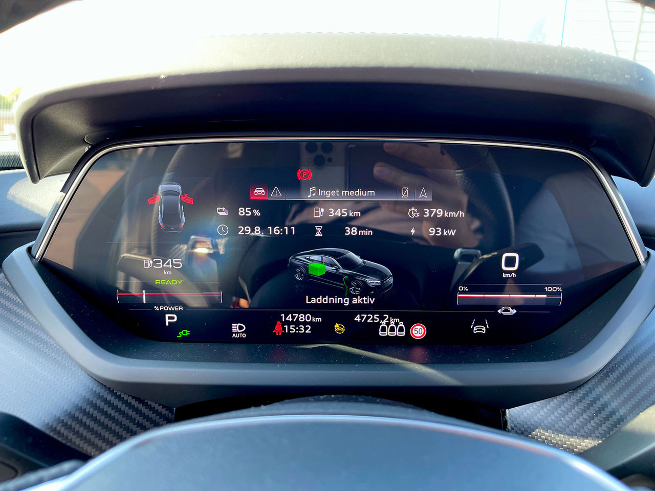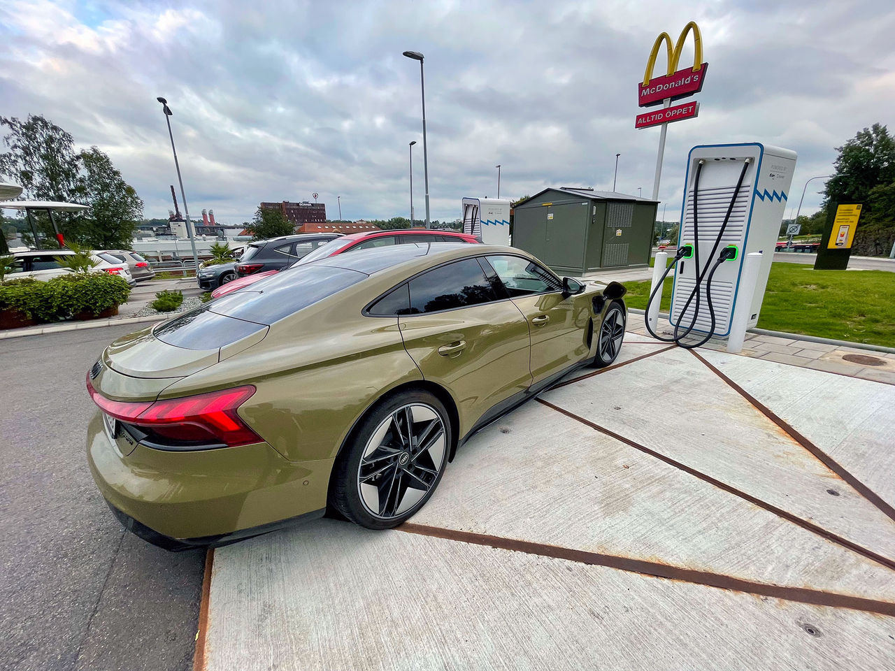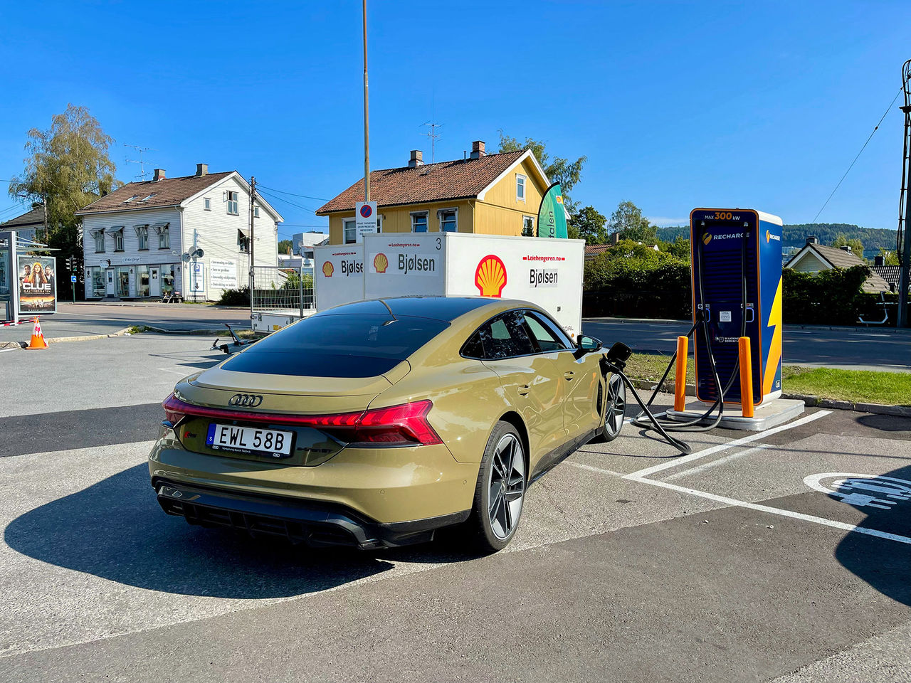 Det låg ett Audi-laddar-kort i bilen men att använda det hade varit både sniket och fusk så det lades undan. Målet var som sagt inställt på Norge, närmare bestämt Oslo. 524 kilometer. Teoretisk räckvidd för bilen är 472 kilometer, men när den är fulladdad står den på 380-400 kilometer. Så rent teoretiskt borde vi klara oss på en laddning, men jag bestämmer mig ändå för att stanna både i Örebro och Karlstad på vägen. Snabbladdning är fantastisk, så klart, men problemet är att man bara vill ladda till 80 procent, sedan går det segt. Nu betalar man per kWh, så har man tiden är det inte något problem egentligen men i det här fallet så får snabbheten vara en del i testet så då får vi räkna bort räckvidden över 80 procent. Eller det är iallafall planen innan vi åker iväg, men det visar sig att den här bilen laddar tillräckligt snabbt upp till 90 procent, men generellt så ska man nog räkna med att bilen bara har 80 procent av räckvidden vid långfärd. Vilket i Audins fall betyder dryga 30 mil. Hade det varit vinter hade vi fått dra ner den siffran ytterligare, eller helt enkelt vara tålmodig och ladda hela vägen till 100 procent. Vi rullar iväg från Stockholm. Första stoppet är Örebro och jag låtsas att jag har usel koll på laddnätverk. Vilket är rätt sant, det är liksom en sak som man inte nördar ner sig i innan man verkligen måste. Så Ionity i Örebro är första stoppet. Eftersom jag inte använder det där laddkortet i bilen får jag ingen rabatt utan det blir fullpris som gäller, så prisexemplen i den här artikeln är worst-case-scenario. Men jag känner mig rik eftersom jag åker dyr bil. Till Örebro är det nästan exakt 20 mil och det är ypperlig väg och inte helg eller rusning, så resan är en fröjd. Audin är för mig kanske den ultimata bilen, precis som syskonet Porsche Taycan. Man sitter som i en sportbil men behöver inte göra avkall på bekvämligheten. Det finns gott om plats, stolarna är as-sköna och även om de är sportiga och håller kroppen på plats så har de inbyggd massage. Det bästa av två världar alltså. Väl framme i Örebro är det helt tomt på Ionity, så jag stoppar i sladden och drar igång laddningen med appen. Fungerar precis som det ska, så jag går på toa och köper en glass. När jag kommer ut från Circle K så har det dykt upp en VW ID.4 och två Kia e-Niro, så jag kom i rätt tid för nu var det fullt. Att laddning ska vara smidigt handlar ju dels om att laddarna ska funka och vara snabba, men också om att de ska vara lediga. Det här är en fredag förmiddag så inte så många på vägarna. Det rullar på bra med laddningen och jag får ut nästan 150 kW från laddaren. Det går inte så snabbt så att jag kan dra direkt efter toapausen, men det är faktiskt bara skönt med en liten paus. Efter en knapp halvtimme avslutar vi laddningen och drar vidare. När man kör på Ionity utan att vara kund via sitt märke eller något annat så betalar man fullpris, vilket är dyra 8,70 kronor per kWh. Exakt hur mycket jag laddade och vad det kostade vet jag dock inte eftersom jag inte ser någon laddningshistorik i appen (enligt den har jag laddat noll) och på kreditkortet kan jag just nu bara se dragningar på 10 spänn per laddning. Vi får hoppas att det fortsätter vara så. Trist för den här artikelns skulle, trevligt för mitt konto. Hur som helst, vidare ut på vägarna och nu är det lite 2/1-vägar ett tag. Man hatar ju dessa, men det är skönt att ha rejält med kraft om man vill hinna köra om någon husbil. Det är inga problem att hinna med det med den här bilen om man säger så. Faktum är att man får lägga band på sig, för man vill ju inte köra olagligt. Elva mil senare är vi i Karlstad. Med 22 mil kvar till Oslo hade vi med en bil med en gnutta längre räckvidd kommit fram utan att ladda en gång till, men ett stopp tar ju faktiskt inte så lång tid. Även den här gången fanns det plats på stationen, av de fyra laddarna var det bara en som var upptagen, denna gång en ID.4. Audin fortsätter att prestera bra med laddningen även om det den här gången bara ligger och tuffar på strax över 100 kW-strecket. Över 80 procent ramlar det lite, ner till ungefär 80-85 kW, men det är helt ok så jag kör på till 90 procent. Efter 90 så ramlar det ner rätt friskt så då känns det inte värt. Även denna laddning har hittills kostat mig 10 spänn. Innan vi åker över gränsen till Norge så stannar vi i Töckfors för att handla lite saker till våra norska vänner. Här var det ju en miss i planeringen eftersom det fanns laddstationer även här, det hade ju varit smartare att ladda och handla samtidigt. Nu har vi bara laddat i en timme totalt så ungefär en halvtimme förlorat på dålig planering. Kan man leva med. Efter lite visande av coronapass och några härliga mil in till Norge var det dags för solsken och folkfest på stan i Oslo, mycket trevligt! Nu var det dags att bege sig av hemåt. Jag hade en eller tre mil tillgodo om vi hade åkt till Karlstad utan att ladda, men det känns dumt så jag letar laddare runt kvarteren där vi bodde. Hittade en station från laddnätverket Mer som finns mycket av i Norge, och även i Sverige. Men de (ursäkta) jävla stolpskotten har en app för Mer Sverige och en för Mer Norge. Tror ni att man kan ladda på norska Mer-stationer med den svenska appen? Nope. Tror ni att den norska appen finns i svenska App-store? Nope. Ridå. Istället drar jag några minuter bort till en Shell-station med Recharge-laddare. Något geni har satt fel ID-nummer på fel laddare här så det tar ett tag innan jag får igång laddningen, men sedan rullar det. Det går segt i början, runt 65 kW, men det beror nog på att bilen och batteriet är kallt. Efter ett tag drar det igång och jag får i nästan exakt 50 kWh för 5 norska spänn stycket, alltså 250 norska kronor (typ exakt samma i svenska). Smidigt och helt o