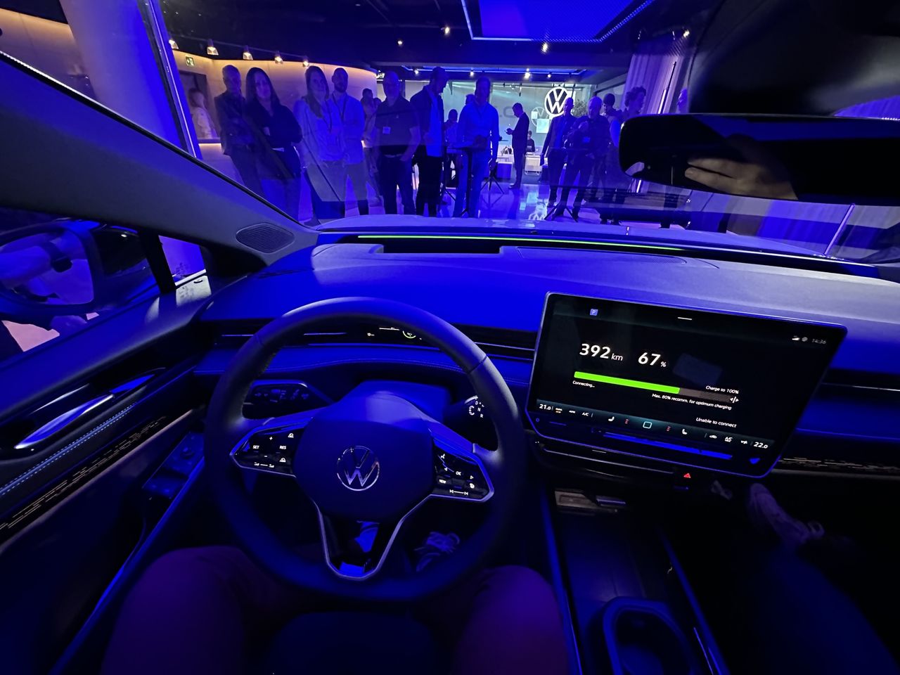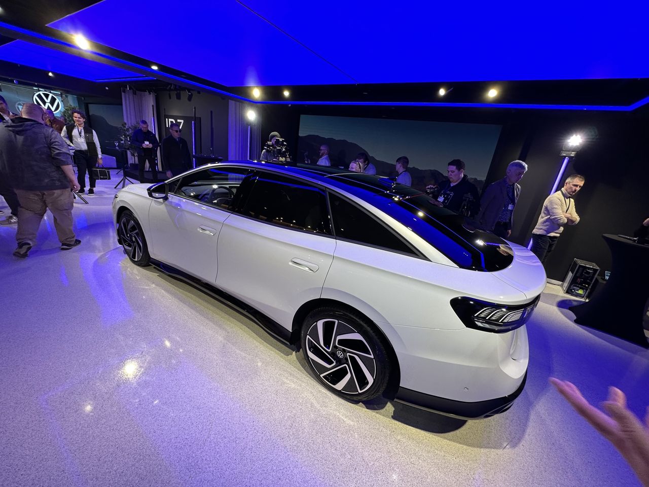 Så var då nya Passat, förlåt ID.7, här. Bilen är alltså helt eldriven och Volkswagen är mycket stolt över att den ska komma upp till 70 mil på en laddning och ladda iaf helt ok snabbt, 200 kW. Men det är den lite dyrare versionen som får det större batteriet, den vanliga versionen laddar 170 kW och kommer dryga 60 mil, vilket borde räcka för de flesta.