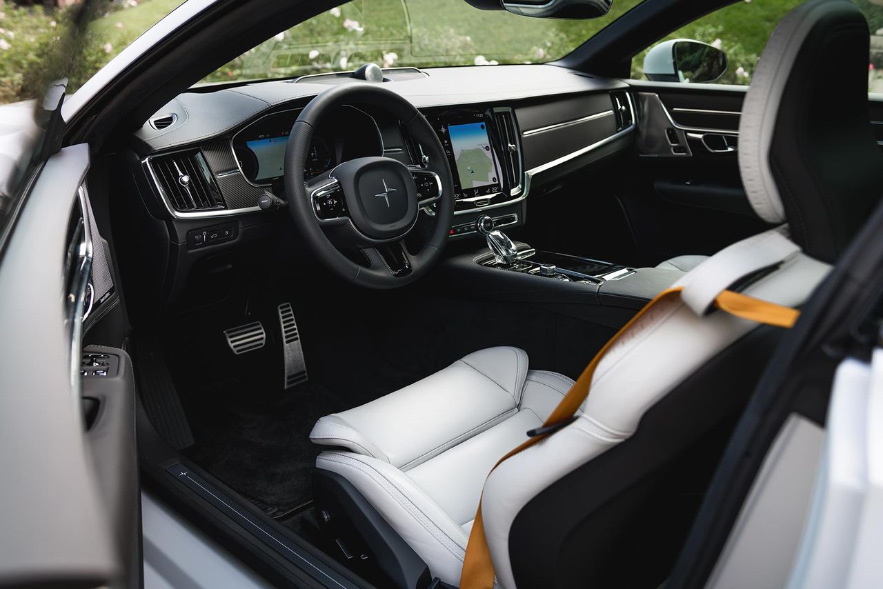 Inredningen går att få i helsvart eller svart med vita säten. Det vita överraskar, eftersom inte hela inredningen är ljus och sätena är mer vita (om än med en svag grå ton) än beiga känns det piggt istället för just beigt. Säkerhetsbältena är så klart Polestar-gula. Förutom på ratten hittar vi Polestar-loggan på två ställen, på växelspaken av kristall och i taket. Just detaljen i taket är verkligen lysande.