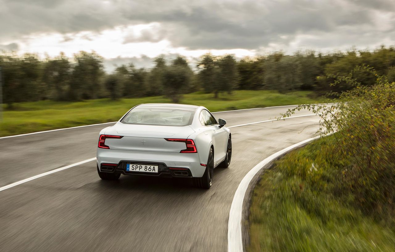 Standardläget är att bilen ligger i hybridläge och det är ju rimligt, det är ju en hybridbil. Men batteriet är relativt stort på den här och man ska kunna köra upp till 125 km enligt WLTP-cykeln. Packet är på 34 kWh så Polestar har inte gjort allt man kunnat för att få ut så lång räckvidd man kan. Nä, batteriet finns där av två anledningar. För att köra tyst och trevligt i stan, och då räcker 125 km långt, och för att göra den här bilen snabb som attan. Två elmotorer finns, en för varje bakhjul. De är på 85 kW styck och ger alltså totalt 170 kW, 232 hästar och 450 Nm. Slår man om till Pure, läget för enbart eldrift, har man alltså kraft så det räcker för att köra till jobbet och tillbaka. Polestar 1 går att köras på ren el upp til 160 km/h, efter det kickar bensinmotorn in och hjälper till. Men elmotorn är med hela vägen upp till 250 km/h. Att man har två elmotorer gör att man kan driva bakhjulen separat och det använder man för att trycka bilen ur kurvor effektivare. Istället för att bromsa hjulet som är på insidan av kurvan ökar man kraften på hjulet som är på utsidan av kurvan. Effekten i körningen blir ungefär densamma men det är så klart trevligare att få en knuff istället för att bromsas in.