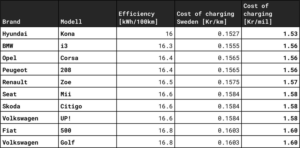Överst på listan över de mest energieffektiva bilarna landar Hyundai Kona. Den kostar 1,53 kr per mil, vilket gör att sträckan mellan Stockholm och Göteborg på omkring 470 kilometer landar på en energikostnad på 72 kr.