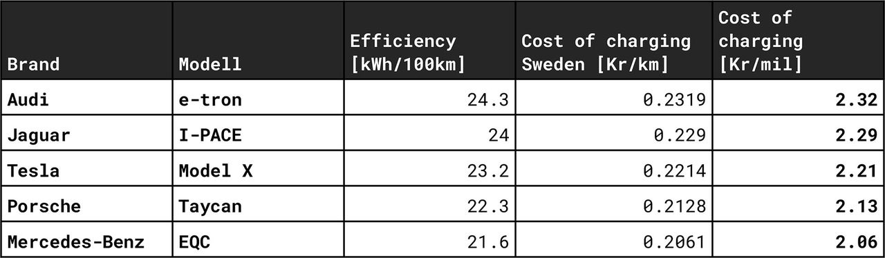Jämförelsevis landar Audi e-tron och Teslas så hypeade Model X på 2,32 respektive 2,21 kr per mil.