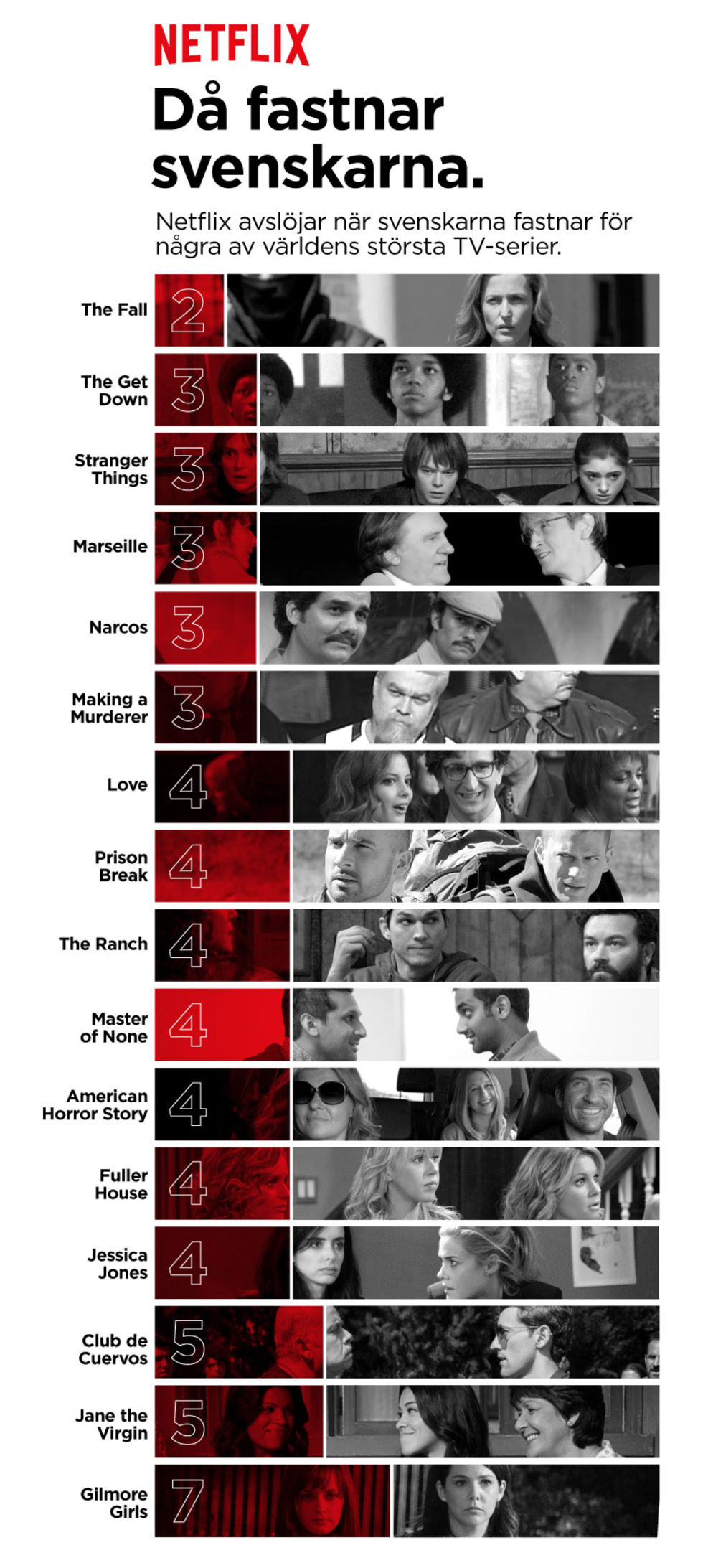 Netflix har genomfört en studie på den svenska tv-marknaden för att undersöka efter hur många avsnitt av en tv-serie svenskarna bestämmer sig för att se klart hela serien.Det här är givetvis en rätt så subjektiv undersökning beroende på hur man definierar vilket avsnitt någon "fastnar" för en tv-serie. Enligt Netflix metodik är detta om minst 70% av de som såg ett visst avsnitt i serien även kollade klart på hela tv-serien. Det vill säga att i till exempel fallet "Stranger Things" i infografiken ovan så kollade minst 70% av de som såg det tredje avsnittet i serien även klart på hela säsongen.Under "Läs mer" hittas infografik på när svenskarna "fastnade" för 15 populära tv-serier. Snabbast verkar vi ha fallit för "The Fall" medan "Gilmore Girls" verkar ha haft den mest svårflörtade publiken.
