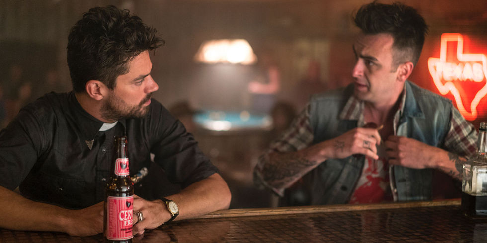 I ett flådigt hotellrum lokaliserat i The four seasons i Beverly hills sitter jag och två andra journalister och försöker få ut något värdigt ur huvudrollsinnehavaren i tv-serien Preacher. Dominic Cooper är oerhört medietränad och han svarar försiktigt på våra frågor samtidigt som han undviker ögonkontakt in i det yttersta. Vi pratar om hur svårt det var för honom att ignorera sin brittiska dialekt då Jesse Custer gärna brer på engelskan i all sin bonnläppiga texas-manér. Efter femton minuter av småprat känner vi oss rätt mätta och inser att det kanske inte finns så mycket mer att hämta hos den här väldoftande och välpolerade mannen. Vi tackar för oss och välkomnar nästa intetsägande, medietränade skådespelare som är Ian Coletti. Det är den unga killen som fått rollen som Eugene, även kallad för Arseface, i tv-serien och serieboken.Det är full förståeligt varför just han fått rollen som Eugene. Hans ögon är intensiva och djupa vilket är prioriterat när det gäller en karaktär som inte kan uttrycka sig med hela ansiktet. Efter sju timmar i sminket, som resulterade i ett hål till mun, kunde Ian inte göra så mycket annat är att förlita sig på ögonen och kroppsspråket. Precis som Eugene drack Ian sin mat under filminspelningar och ingen kunde förstå ett ord av vad han sa. Han försäkrar oss dock om att det här är vad han vill göra och han älskar att spela Arseface fast han kan låta lite gnällig. PR-tjejen rycker till och rundar av den intervjun och i samma anda välkomnar hon Garth Ennis som är författaren till Preacher.Vi möts av en äldre irländsk man som ser oerhört allvarlig ut. Han pratar om sina intressen som barn vilka var att se på gamla västernfilmer ihop med sin pappa. Från de filmerna kom sedan i ett senare skede inspirationen till Preacher. När alla härmade Marvel och DC med sina superhjältar tog Garth Ennis det till en helt annan nivå med sin blodiga och övernaturliga western-serie. Den karaktär som han tog till sig allra mest, och som han håller allra kärast, är Cassidy. Den irländska vampyren, som också är Jesse Custers högra hand även om de sällan är överens om det religiösa, påminner Garth om sin egen färd till USA som immigrant. Det finns mycket i Cassidy som jag kan relatera till säger han och pillar nervöst med en penna som ligger på bordet.Jag som redan har sett de fyra första avsnitten av Preacher frågar lite nyfiket hur Garth tror att fansen kommer att reagera över att det har gjorts så många ändringar i tv-serien jämfört med hans serier? Serien börjar mitt i handlingen där Jesse redan har övergivit prästyrket och ger sig ut på en resa för att hitta gud och konfrontera honom. I tv-serien får vi följa Jesse som en mänsklig och rätt dålig präst som kämpar med att förtrycka sin vilja att vara rebellisk och laglös, han är långt ifrån den Jesse som vi känner igen från serieböckerna. Andra ändringar som gjorts är bland annat att Tulip är vit och blond i serieböckerna men afroamerikansk i tv-serien.-Vi ville ha mångfald bland skådespelarna säger Garth Ennis. Hade jag skrivit serien i dag så hade karaktärerna varit totalt annorlunda. Jag hade till exempel gjort Cassidy till brittisk istället för irländsk.I övrigt är han lugn över ändringarna som har gjorts av Seth Rogen, Evan Goldberg och Sam Caitlin. Han observerar som alla andra tittare och känner sig trygg i att tv-serien andas Preacher och att alla karaktärerna är precis som han tänkt sig dem. På frågan om det blir fler Preacher-serier nu i och med tv-serien så blir svaret snabbt nej. Han är klar med Preacher på så sätt och har inga tankar på att återuppväcka björnen som sover. När Seth Rogen och Evan Goldberg pratar med oss lite senare under dagen berättar de att tanken att få Preacher till antingen stora eller lilla duken har varit på tapeten sedan de gjorde Pineapple Express. Sedan dess har idén tagits upp av bland annat av Sam Mendes och HBO utan resultat då serien har en sådan otroligt rik handling som nästan är omöjligt att porträttera i en och samma veva. Därför föll det sig naturligt att göra en serie av det. Det pratas om duons vilja att göra coola slagsmålsscener då de aldrig fått uppleva något sådant i sina egna filmer. Quentin Tarantino nämns ofta av Seth Rogen så det är uppenbart att regissören gett honom rikligt med inspiration till sina egna projekt. Rummet fylls av skratt när Seth berättar hur de gav Joseph Gilgun rollen som Cassidy. Efter en hel drös med auditions bestämde de sig för att kolla in en dvd skickad till produktionsbolaget. På den dvd:n kunde de se Joseph spela in sin audition med sin mamma i hennes källare, där han också bodde. Med detsamma insåg de hur rätt han var för rollen men tyvärr hade Joseph försvunnit ut i vildmarken och bodde för tillfället i en hydda utan någon elektricitet eller mobiltelefon. De kämpade rätt länge innan de fick tag i honom och erbjöd honom då rollen som för övrigt passar honom som handen i handsken. En mer öppen, galen och sinnessjuk människa är svårt att hitta i den till ytan glansiga Hollywood.Säga vad man vill om Preacher men kärleken finns och engagemanget är på topp. Det ser jag bara genom att titta på Seth och Evan berätta om hur processen har gått till och hur mycket de lovar att serien kommer att öppna upp sig mot mitten av säsongen. Håll ut uppmanar de fansen, snart får ni se den Preacher som både ni och vi blev uppväxta med.Preacher visas exklusivt på Viaplay i Sverige. Produktionen är praktiskt taget densamma som Breaking Bad då Sam Caitlin är den som roddar allt sådant. Inspelningsplasten är Alberqueque i New Mexico och Preacher har av kritiker kallats för den nya The walking dead. Blodigt, mörk humor och övernaturligt är ingredienserna.