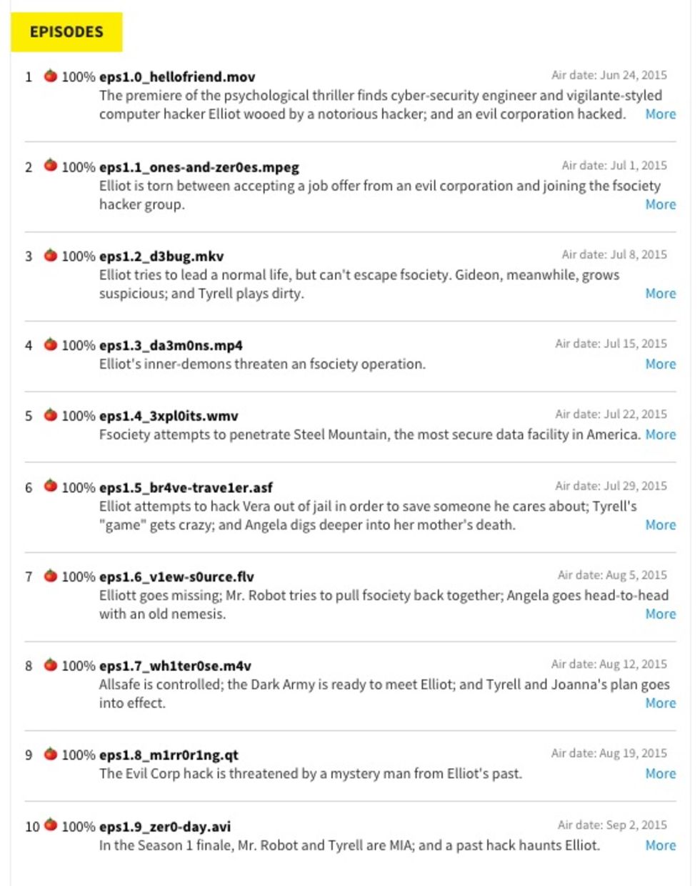 Den kritikerrosade TV-serien Mr. Robot verkar även ha gått hem hos tv-tittarna och Zap2it skriver att TV-serien slagit rekord på film- och tv-rankingsajten Rotten Tomatoes och samtliga av seriens avsnitt har fått 100% i betyg vilket den ska vara helt ensam om.Sammantaget, det vill säga det betyget Rotten Tomatoes egna kritikerrecensioner gett serien, har Mr. Robot fått 98% i betyg vilket gör att den hamnar på andraplats i den rankingen efter Better Call Sauls första säsong och före Game of Thrones säsong 5 (97%) och Game of Thrones säsong 4 (96%).OBS! Inga spoilers i kommentarerna.