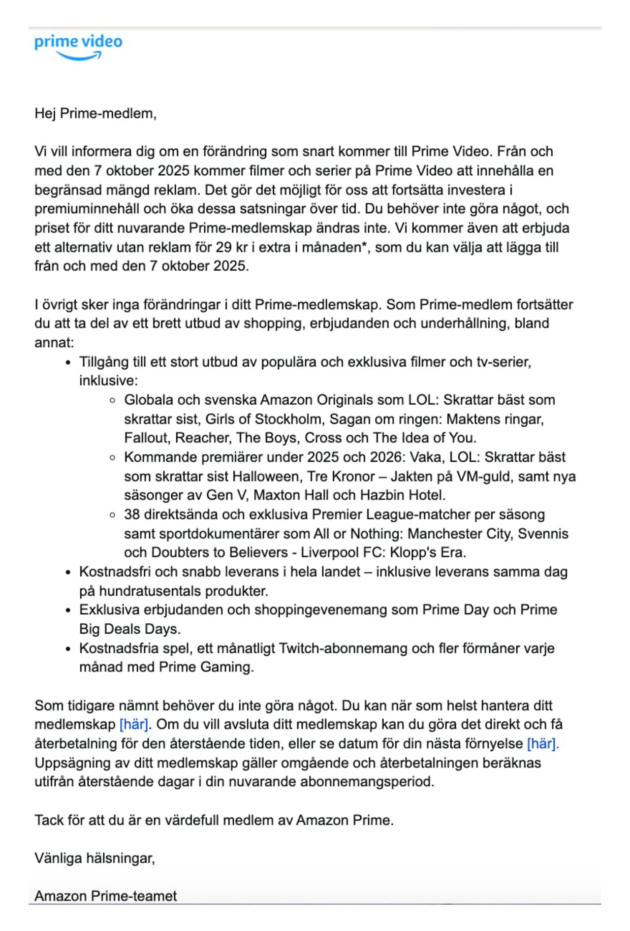 Amazon har meddelat att man nästa månad kommer att börja visa reklam i de filmer och tv-program som man visar på sin streamingtjänst Prime Video. Amazon har kört annonser på Prime Video i USA och på andra marknader sedan januari 2023. Där finns det möjlighet att betala extra för att slippa reklam. Det alternativet kommer även att införas här i Sverige till en extrakostnad på 29 kronor i månaden, något som innebär en kostnadshöjning på cirka 40 procent för dem som idag betalar 69 kronor i månaden för Prime Video.Den 7 oktober lanseras annonser på svenska Prime Video. Ni kan läsa mailet från Amazon som gått ut till Prime Videos kunder här nedanför.