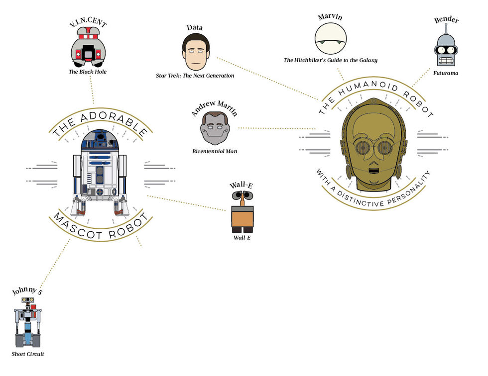 Shutterstock och Pop Chart Lab har tagit fram den här infografiken där man kan kolla in hur grejer från Star Wars-universumet har influerat kända karaktärer från andra filmer och även hur dessa är sammankopplade.Det är en ganska så omfattande grafik och skulle du vilja se den i lite större format så hittas det här. Nedan kan ni se hur de två robotarna R2-D2 och C-3PO anses ha influerat ett gäng med andra kända fiktiva robotar.