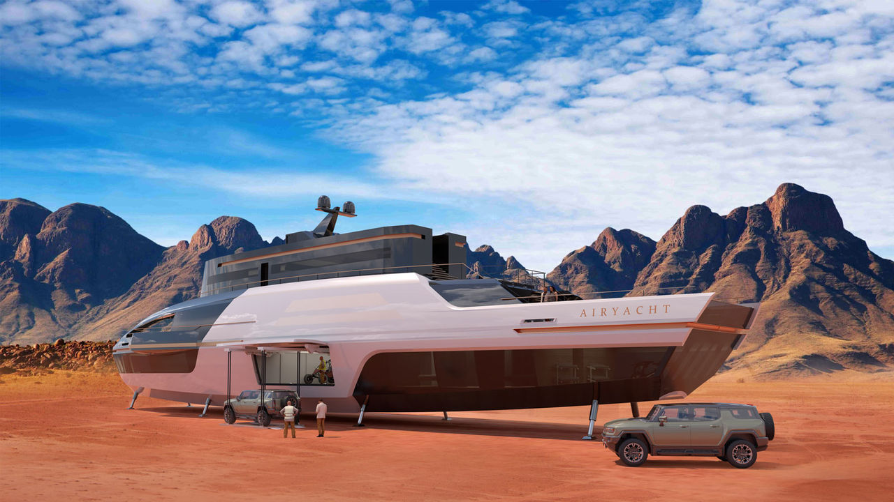 Ett schweiziskt företag som heter AirYacht har visat upp ett koncept på ett flygande fordon som tack vare ett modulärt utförande även går att framföra på vatten. AirYacht är ett 200 meter långt luftskepp på vilket man har fäst en 60 meter lång lyxyacht med 750 kvadratmeter boendeyta ombord. Tanken är att lyxyachten ska kunna firas ner från luftskeppet, se bild ovan, och parkera om ägaren bestämmer sig för att stanna någonstans (se bild nedan). Därefter kan luftskeppet skickas iväg för att sedan anropas när det är dags att glida vidare. På samma sätt kan båten även firas ner i vattnet om ägaren bestämmer sig för att hen hellre vill kryssa fram på havsnivå. AirYacht kommer att kunna flyga på upp till 3000 meters höjd men vill passagerarna ha bästa utsikt rekommenderas en flyghöjd på 100 - 200 meter. När den framförs på vatten ska toppfarten ligga på runt 50 knop. AirYacht är som sagt än så länge bara ett koncept och vad det hela kommer att kosta finns det än så länge inga uppgifter om. Företaget uppger att man planerar att ha ett första exemplar av AirYacht färdigt någon gång under 2026.AirYacht är för övrigt den andra flygande lyxyachten som presenterats i år. I början av året visade Lazzarini Design Studio upp katamaran-luftskeppet "Air Yacht". Även det har möjlighet att landa på vatten men saknar den modulära design som "AirYacht" har. Här nedanför hittas en intervju med Mathieu Ozanne, en av grundarna till AirYachts, samt lite fler bilder på konceptet.
