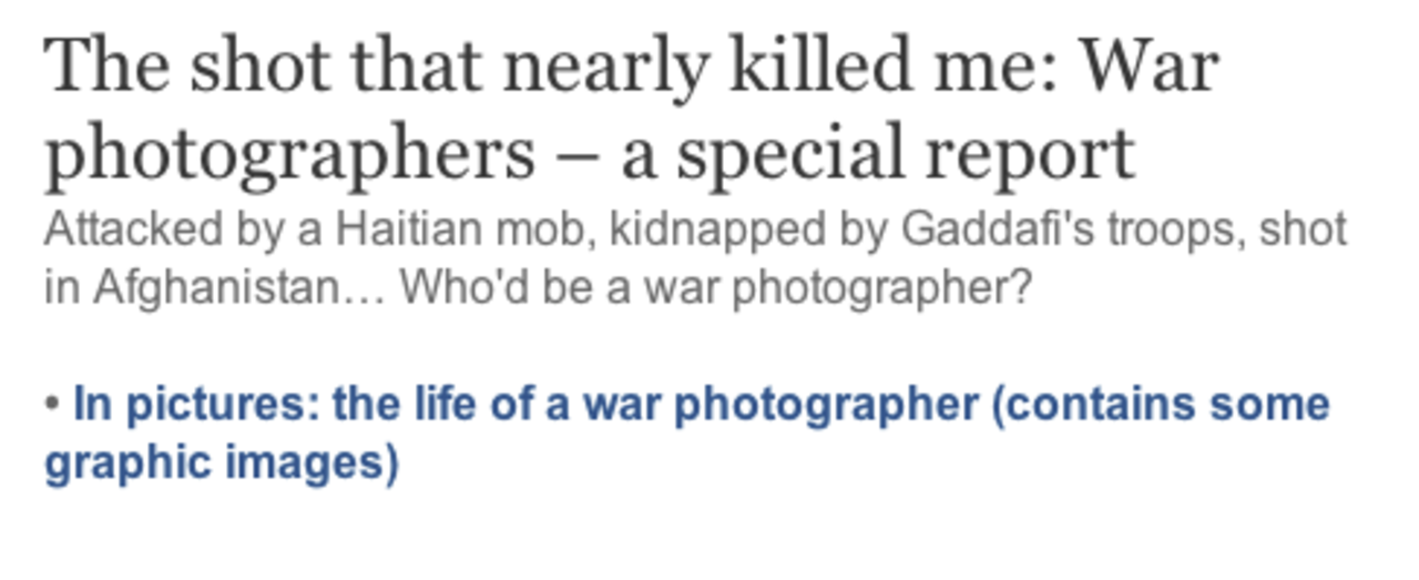 Tidningen The Guardian har på sin sajt en artikel som är skriven av ett helt gäng krigsfotografer. Artikeln är hemskt intressant att läsa och ger en bra inblick i livet som krigsfotograf. Den har dessutom ett helt gäng bra men hemska bilder.Till och med rubriken är grym och säger det mesta: "The shot that nearly killed me".