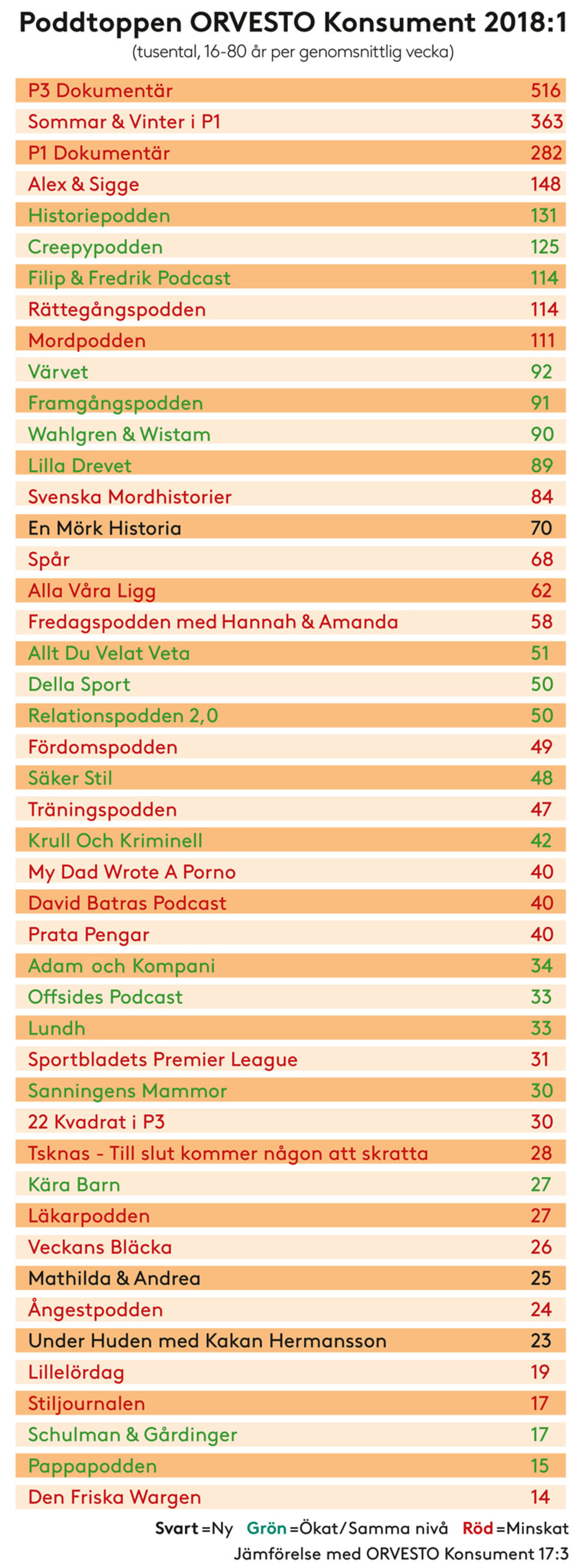 Orvesto Konsument har tagit fram statistik över hur det lyssnas på podcast i Sverige och kan konstatera att podcast-lyssnandet fortsätter att öka. I sin senaste sammanställning uppger Orvesto Konsument att cirka 1,5 miljoner svenskar varje vecka lyssnar på minst en podcast. Sveriges Radio toppar statistiken då deras poddar intar de tre översta platsen i Orvestos statistik. Det handlar om P3 Dokumentär (516.000 lyssnare), Sommar & Vinter i P1 (363.000 lyssnare) och P1 Dokumentär (282.000 lyssnare). Populärast efter Sveriges Radio är Alex & Sigge som har 148.000 lyssnare och därefter hittas Historiepodden med 131.000 lyssnare.
