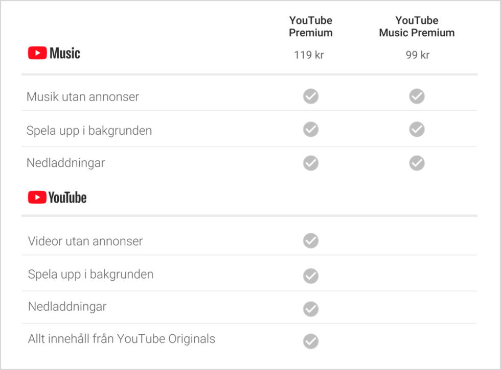 Google verkar äntligen känna att det är dags att satsa lite på oss svenska kunder. Gänget har nämligen lanserat Youtube Music och Youtube Premium, vilket kallas Youtube Red i staterna, i vårt avlånga land. Med Youtube Music kan du avnjuta musik, både som ljud och musikvideor, utan någon kostnad via en annonsfinansierad version. Youtube Music Premium kostar 99 kronor i månaden ger dig lite extra funktioner som möjligheten att lyssna i bakgrunden, ladda ner musik samt slippa annonser. Detta är inte allt! Youtube Premium kommer även till Sverige och ger användare en reklamfri upplevelse samt möjligheten att spela upp videor i bakgrunden och ladda ner videor. Med Premium får du även tillgång till Youtube Original-serier utan extra kostnad, vilket inkluderar bland annat Cobra Kai, Impulse och F2 Finding Football. Premium kostar 119 kronor i månaden. Kör du på Youtube Premium så får du även tillgång till Music Premium. Youtube Music-apparna hittar ni här: Youtube Music till Android. Och här: Youtube Music till iOS. De nya prenumerationsmöjligheterna är tillgängligt precis nu. Det kommer finnas möjlighet att testa Youtube Premium i tre månader helt gratis, men därefter kostar det 119 kronor. Det kommer även finnas ett familjekonto för 179 kronor i månaden.