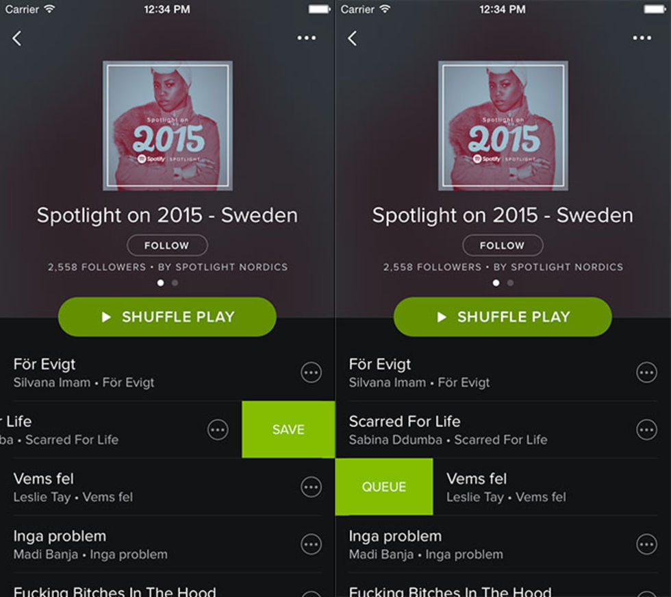 Idag lanserar Spotify tre nya funktioner i sin mobila app till iOS. Det handlar om "Touch Preview", "Swipe to Save" samt "Recently Played" vilka samtliga antagligen kommer underlätta användandet av tjänsten.Touch Preview (bild ett och två ovan samt videon nedan) är en funktion som gör att man snabbt kan testlyssna på en låt genom att hålla fingret nedtryckt på låten. När man lyfter fingret återgår Spotify till att spela den musiken som var på tidigare. Ett sätt att snabbt få en uppfattning om en låt med andra ord. Touch Preview kommer att vara tillgängligt i låtlistor, radiostationer och på andra ställen i klienten.Med Swipe to save (bilderna nedan) kan man snabbt spara eller köa en låt genom att svepa till höger eller vänster på låtens namn. Recently Played (bild tre ovan) är en funktion som jag redan trodde fanns och den listar helt enkelt det man lyssnat på tidigare. Denna lista går att rensa manuellt om man tycker att man har för pinsam musiksmak och inte vill visa upp denna för andra.Den uppdaterade iOS-appen börjar rullas ut idag och Spotify säger att de nya funktionerna givetvis kommer att dyka upp i deras andra mobila plattformar med men kan inte uppge exakt när detta sker. Här nedan kan ni kolla in en video på Touch Preview och Swipe to save.