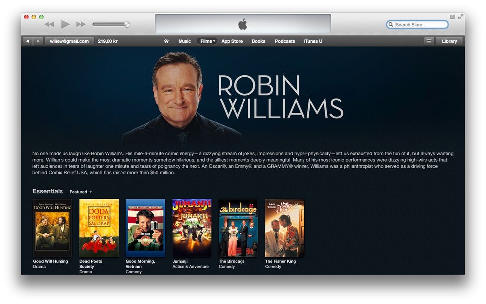 Efter gårdagens tragiska besked att den enormt hyllade skådespelaren Robin Williams hade avlidit har Apple lagt upp en hyllningssida till Williams på sin webbplats samt skapat en ny sektion i deras digitala butik iTunes som är helt dedikerad till Williams och saker han medverkat i.Apple har tidigare gjort liknande hyllningar till bland annat Rosa Parks och Nelson Mandela såväl som Apples grundare och före detta VD Steve Jobs.Även Apples nuvarande VD Tim Cook stämde in i hyllningskören till Robin Williams på Twitter.