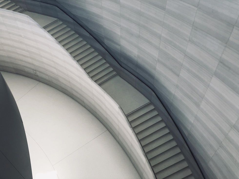Taket är världens största tak gjort av kolfiber. Det är stort, men väger ändå rimliga 73 ton. Det imponerande här är att taket hålls upp av glaspartierna som går runt övervåningen. 44 stycken glaspartier av 4-glasfönster som har en höjd av 6,6 meter håller uppe taket, det finns alltså inte en enda pelare för att hjälpa till. Konstruktionen ska klara av jordbävningar och taket ska ligga kvar på plats även om man tar bort vartannat glasparti. All el, allt vatten som behövs till sprinklers, alla ljudkabler och så vidare har man placerat i fogarna mellan glaspartierna. Kolla in bilder från bygget här. Överambitiöst, ja visst, men det ger en riktigt cool känsla. Kolla in den här panoramorna jag tog för en smak av den känslan (klicka för större). Det enda som "stör" känslan på övervåningen är hissen ner. Den är helt rund och snurrar dessutom när man åker i den. Nästan ett halvt varv, 171 grader, hinner man med på den korta åkturen. Vill man inte åka hiss kan man istället gå i de fantastiska trapporna som lyckas med konststycket att knappt synas och vara mäktiga på en och samma gång. Det finns en på varje sida och ryktet säger att första versionen som gjordes inte riktigt hade rätt känsla, så man gjorde helt enkelt om dem. Jag hoppas att marmorn återanvändes eller skänktes till välgörande ändamål.