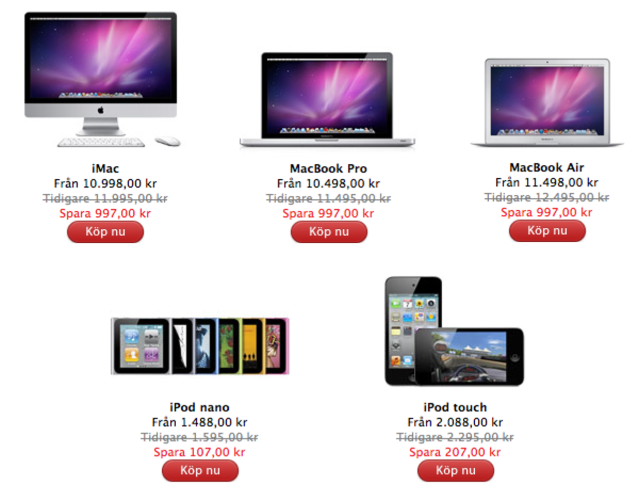 Idag är det det så kallade shopping-dagen Black Friday [wiki] i USA och det har smittat av sig till Apples webbshop även här i Sverige.Här till höger kan ni se vilka varor som är prissänkta i den svenska Apple Store nu under dagen. Det handlar om iMac, MacBook Pro och MacBook Air som alla är prissänkta med cirka 1 000 kronor samt iPod touch och iPod nano som är prissänkta med cirka 200 kronor respektive cirka 100 kronor.