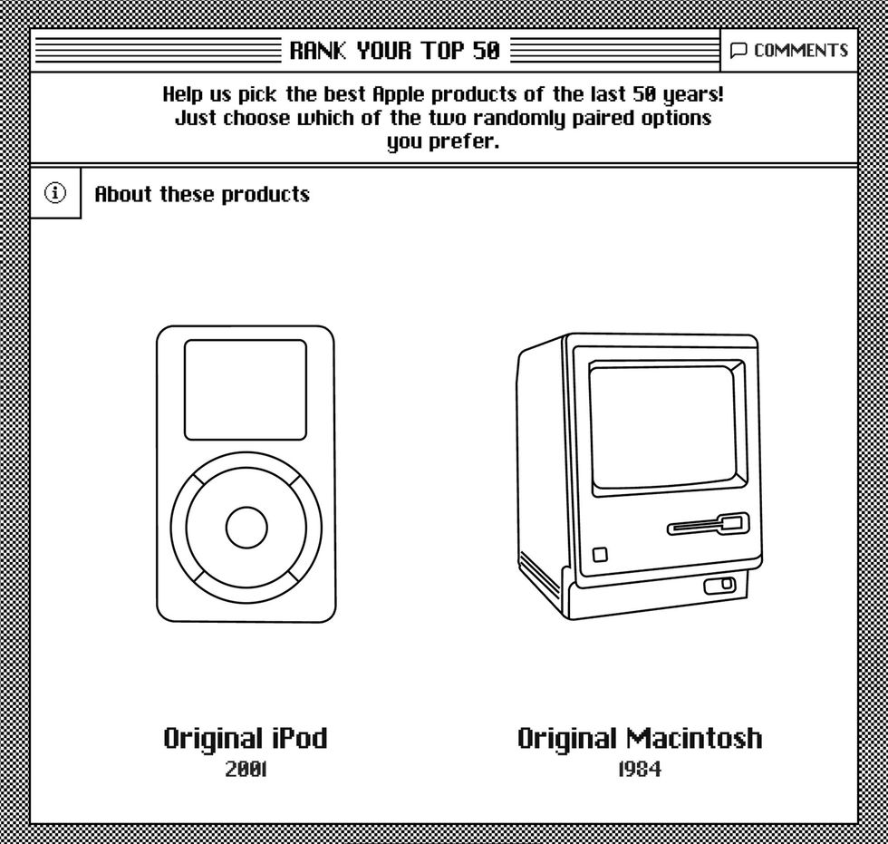 The Verge har gjort en rolig grej inför Apples 50-årsfirande där man helt enkelt låter läsarna välja vilken produkt som är viktigast för dem. Det hela är utformat som ett spel där man får välja en av två produkter och sedan gå vidare.