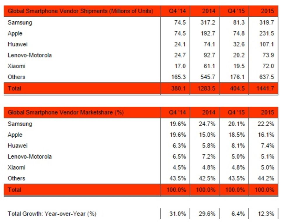 Smartphone-tillverkare levererade en hel del telefoner under 2015. Enligt Strategy 1,4 miljarder enheter för att vara exakt, vilket är en ökning på 12 procent jämfört med 2014. Precis som tidigare ligger Samsung på toppen med sina 319 miljoner skeppade enheter och Apple norpar andraplatsen med 231 miljoner enheter. På tredjeplats ser vi Huawei med 107 miljoner.