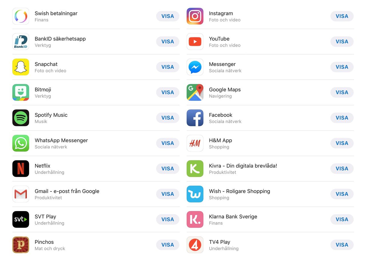 Årets bästa appar till Apple Watch (Apples redaktions val) - WaterMinder - Lifesum - 10% Happier - Carrot Weather - FunGolf GPS - Swing Tennis Tracker - Slopes - App in the Air - Overcast - Just Press Record2018 års mest nedladdade appar i Sverige… För iPhone (Gratis) 1. Swish betalningar 2. Instagram 3. Bank ID säkerhetsapp 4. YouTube: Watch, Listen, Stream 5. SnapchatFör iPhone (betald) 1. Ta Körkort 2. PlantSnap Plant Identifier 3. MammaMage 4. Afterlight 2 5. CamToPlan PRO2018 års mest nedladdade poddar i Sverige… 1. P3 Dokumentär 2. Sommar & Vinter i P1 3. Alex & Sigges podcast 4. Framgångspodden 5. Alice & Bianca - Har du sagt A får du säga BÅrets bästa på Apple Music (Apples redaktions val) Årets artist: Drake Årets nykomling: Juice WRLD Årets sång: I Like It - Cardi B featuring Bad Bunny & J. Balvin Årets album: Golden Hour - Kacey Musgraves