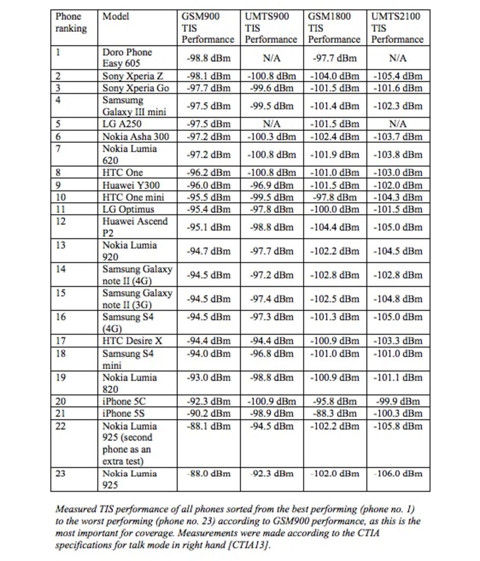 Danska Aalborgs University har undersökt hur bra mottagning de 22 populäraste mobiltelefonmodeller som säljs i Danmark har och kommit fram till att på GSM900-bandet, det som oftast används i glesbygd, är det den svenska mobilen Doro Phone Easy 905 som klarar sig bäst. I rättvisans namn får dock sägas att Doro-telefonen är en av två telefoner i testet som enbart har stöd för GSM och inte UMTS.Undersökningen är beställd av danska Erhvervsstyrelsen som är en myndighet som bland annat reglerar telekom- och internet-frågor. Bland de tre modeller som klarade sig sämst på GSM900-bandet återfinns Nokias Lumia 925 samt iPhone 5S och iPhone 5C. Dessa tre modeller anses ha "ringa" mottagning i det danska testet.De två modeller som klarar sig bäst på GSM900-bandet efter Doro Phone Easy 905 är Sonys Xperia Z samt Xperia Go. Ni hittar resultatet från undersökningen på bilden nedan.