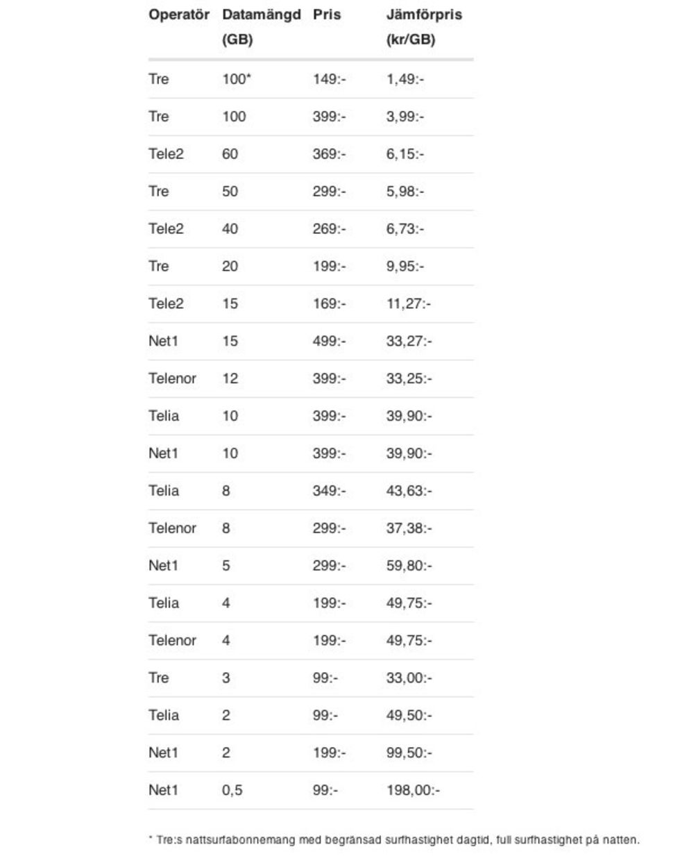 .SE (Stiftelsen för Internetinfrastruktur), organisationen som bland annat tar hand om den svenska toppdomänen .se, har tagit sig en ordentlig koll på den mobila bredbandsmarknaden i Sverige och kommit fram till att det råder ordentliga skillnader på kostnad för ett dylikt abonnemang.Man säger bland annat att det skiljer hela 13000% på det billigaste alternativet, Tre:s "nattsurfabonnemang" 100GB som kostar 1,49 kronor per gigabyte, och det dyraste, Net1 0,5GB som kostar hela 198 kronor per gigabyte.Vidare skriver man att det mellan Tre Large och Telia Large, två abonnemang som båda kostar 399 kronor i månaden skiljer 90GB datatrafik per månad då Telias abonnemang endast innehåller 10GB datatrafik medan man med Tre:s abonnemang får 100GB datatrafik i månaden.I tabellen nedan kan ni kolla in samtliga jämförda abonnemang. Författaren av .SE:s artikel är Rickard Dahlstrand och han jobbar till vardags som projektledare på bandbredds-jämförelsetjänsten Bredbandskollen [länk]. Han har tidigare skrivit en krönika om hur mycket (lite) mobilsurf man får för pengarna och den hittar ni inlänkad nedan.