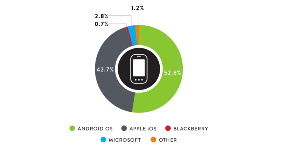 Analysföretaget Nielsen har tagit sig en titt på vilka appar som användes mest i USA under året och för 2015 plockar Facebook hem förstaplatsen då nästan 127 miljoner amerikanska mobilanvändare Facebookar via sin mobil varje månad.Därefter hittas YouTube med cirka 98 miljoner månatliga användare och Facebook Messenger hugger tredjeplatsen med sina lite mer än 96 miljoner användare per månad. Kollar man på hela topptiolistan för 2015 så ser man att de tre företagen Google, Facebook och Apple dominerar totalt då fem av de populäraste apparna kommer från Google, tre från Facebook och två stycken från Apple.Nedan hittas ett diagram på hur det ser ut med fördelningen av mobila operativsystem på den amerikanska marknaden under året. Foto: Nielsen