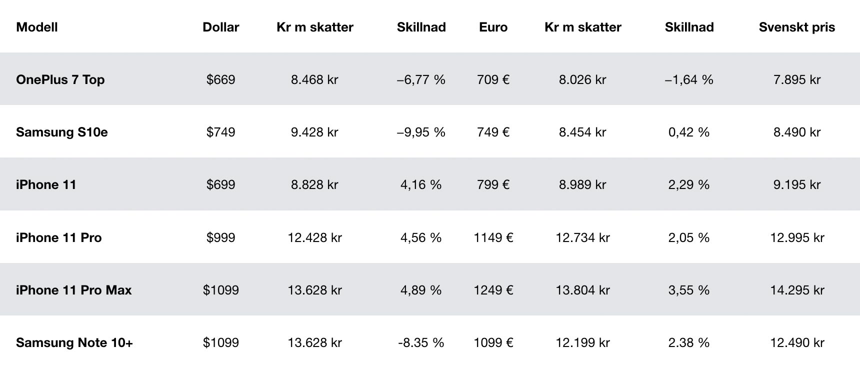 Efter att ha lett den tokiga resan till superdyra telefoner gör Apple något lite oväntat, man sänker priset på iPhone 11. I USA sänkte man priset med 50 dollar men i Sverige sjönk priset bara med 300 kronor, från 9495 kronor till 9195 kronor, även om det är skönt att det går åt rätt håll för en gångs skull. För iPhone 11 Pro och Pro Max höjdes de svenska priserna trots att de i dollar är fortsatt desamma. Den spontana känslan är så klart att Apple fortsätter att överprisa produkterna i Sverige, men det är faktiskt bara delvis sant. Svaret är att den svenska kronan har blivit fortsatt ännu sämre och Apple kör ungefär samma nivåer som konkurrenterna jämfört med andra länder i Europa. Jämfört med USA är däremot priserna annorlunda mot konkurrenterna. Hur mycket det beror på att OnePlus är från Kina, Samsung från Korea och Apple från USA är oklart. Hur som helst, här är svaret på hur mycket skillnad det är i pris.