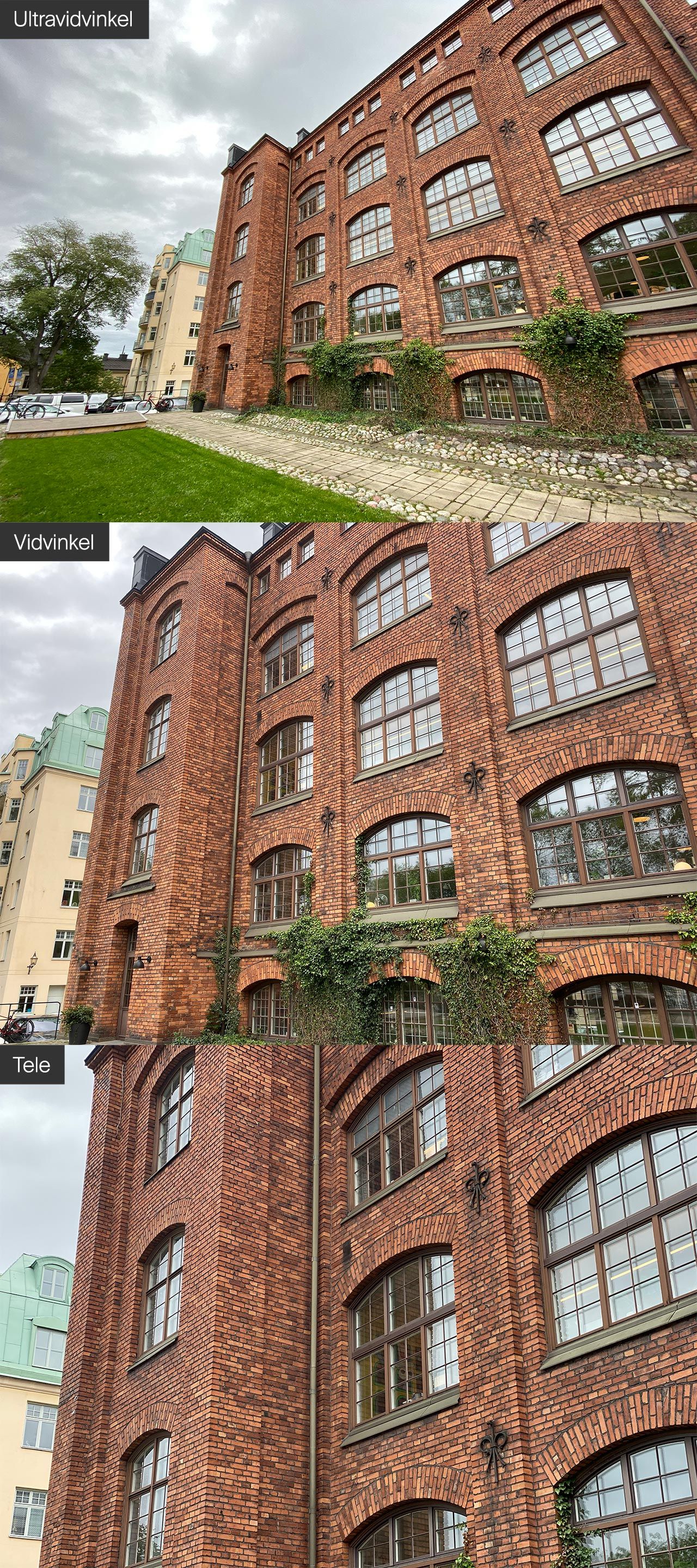 Nivån på kameror i smartphones i dag är väldigt imponerande. Vilken som levererar bäst är ofta en fråga om tycke och smak och det är svårt att vara objektiv. Men något som Apple alltid vunnit på är deras gränssnitt. Det största beviset för detta är väl att i princip alla konkurrenter numera kör en kopia på detta. Och med årets modell så tar man detta ytterligare ett steg. Apples kamerafolk har alltid varit lite bråkiga med att man vill ha så lite inställningar och funktioner som möjligt i gränssnittet. Det har gjort det krångligare för oss som vill få ut det mesta av telefonen, men attityden är rätt. Tanken att alla ska kunna dra upp telefonen, klicka på avtryckaren och få en riktigt bra bild utan att ställa in någonting är väldigt god. I år får kameran ett gäng nya funktioner och dessa är alla väldigt trevligt inlagda i gränssnittet. Kontrollen är bättre än någonsin, faktiskt utan att det blir krångligt eller stökigt. Bra jobbat! Men. Man kan styra blixtar, längt på slutartid på nattläget och massor av annat men varför, varför, varför kan man inte ändra videoupplösningen direkt? Det brinner lite i mitt huvud över detta.Äntligen ultravidvinkel!