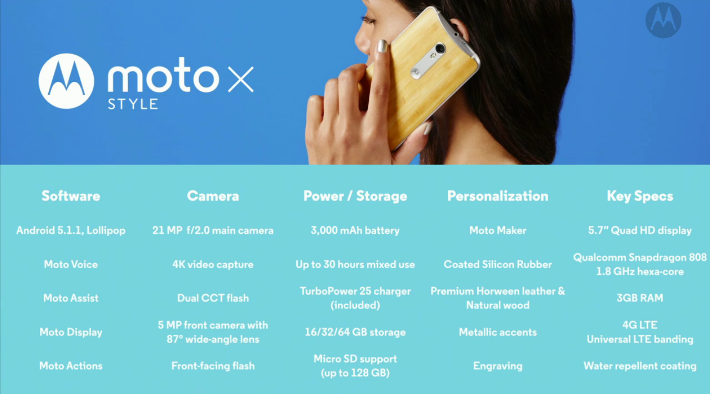Motorola visade upp inte bara en, utan två nya Moto X-lurar vid namn Play och Style. Play har en 5,5 tum stor Full HD-display, medan Style är lite större med 5,7 tum stor QHD-skärm. Play kör Snapdragon 615 med en åttakärnig processor på 1,7 GHz, 2GB ram och 16 eller 32GB. Style kommer vara snäppet vassare med Snapdragon 808, med en sexkärnig processor på 1,8 GHz, 3GB ram och ha antingen 16, 32 eller 64GB lagring.Båda lurarna kommer också vara begåvade med en ny laddningsteknik vid namn TurboPower som gör att du kan ladda telefonen riktigt snabbt. Under presskonferensen fick vi se att Moto X Style laddades upp 50 procent snabbare jämfört med Samsung Galaxy S6. Kameran är den bästa Motorola har byggt. 21 megapixlar har den och enligt Motorola är sensorn bättre på att ta in ljus, har bättre fokus, är snabbare och fångar färger bättre. Och under presskonferensen berättade gänget att de lånat ut luren till fotografer som säger att det är en av de bästa mobilkamerorna på marknaden. En nyhet är också att du nu kan få en baksida av silikon i olika färger, utöver metallic, trä och läder. Tyvärr är inte Motorolas Moto Maker tillgängligt i Sverige, så vi kommer inte kunna modifiera våra Moto X-lurar. Priset är inte spikat, men Moto X Style kommer kosta 399 dollar och release sker i september. Moto X Play kommer kosta 300-400 dollar mindre än topptelefoner och kommer börja säljas i augusti. Svenska priser lär dyka upp inom en snar framtid. Uppdatering: Och där trillade de svenska priserna ner i mailkorgen. Moto X Play finns från augusti tillgänglig för ca 3500 kr. Moto X Style finns från september tillgänglig för ca 4500 kr.Nedan ser ni Moto X Play:s specifikationer och under det hittar ni Moto X Style, samt The Verges snabbtitt på Moto X Style.