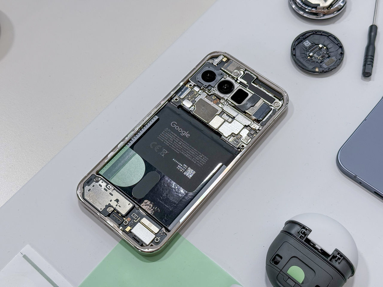 Nu väntar vi på att iFixit ska ge sig på dessa telefoner och verkligen ge dem ett betyg, men Google säger sig ha gjort lurarna lite enklare att reparera. Man har bland annat gjort alla saker som reparatörer ska rycka i gröna. Nu hoppas man ju att reparatören vet vad de ska göra ändå, men ändå. Man säger sig också ha försökt placera saker på ett sätt som gör det enklare att reparera. Men som sagt, vi väntar på att iFixit levererar det slutgiltiga betyget här. Bra ambition har man hur som helst. Den enda skillnaden man ser på baksidan är att Pixel 10 har fått en ny kamera
