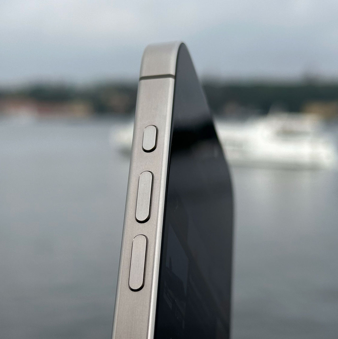 Fyra olika varianter finns av telefonen och alla har titanram, chassi av aluminium och baksida av glas. Pro-modellerna är lite annorlunda byggda i år och att byta baksidan är inte riktigt lika sinnessjukt dyrt längre, från 6895 / 7395 kronor till 2295 / 2695 kronor beroende på modell. Fortfarande mycket pengar, men inte orimligt mycket pengar. Jag hade hoppats att baksidan av telefonerna skulle vara i titan, men det var att begära för mycket. Det hade varit toksnyggt och dessutom hade man sluppit vara lika rädd för att den ska gå sönder. Istället är baksidan av glas som förut och får jag gnälla så är det faktiskt lite trist. Anledningen är främst för att det inte finns något liv i baksidan alls. Det fina med titanen är att det just finns liv i metallen, ett djup och en känsla. Baksidan har inte alls detta och jag kommer nog att sätta på ett skin på min baksida för att matcha titanen. Det ironiska i år är att baksidan på vanliga iPhone 15 har glas som är färgat medan iPhone 15 Pro har genomskinligt glas över målad botten. Det blir lite platt och jag kommer nog försöka hitta ett snyggt skin som matchar titanramen bättre. Den piggaste varianten är vit baksida med vit titan, som betyder att titanen är snudd på silverfärgad. I färgskalan kommer sedan naturlig titan där titanramen har exakt samma ton som Apple Watch Ultra. Riktigt snyggt om du frågar mig, men baksidan är ljusgrå vilket är sobert men inte så spännande. Två mörka varianter finns, svart och blå titan. Dessa är lite trista eftersom titankänslan i princip helt är borta på ramen, båda är mycket mörkare i verkligheten än vad de är på Apples datorgenererade bilder. Personligen hade jag nog önskat att titanramen fortfarande hade tydlig titankänsla på dessa, nu skulle det lika gärna ha varit färgad aluminium. Men överlag så är titanet verkligen välkommet. Det är både snyggt, tåligt och lätt!