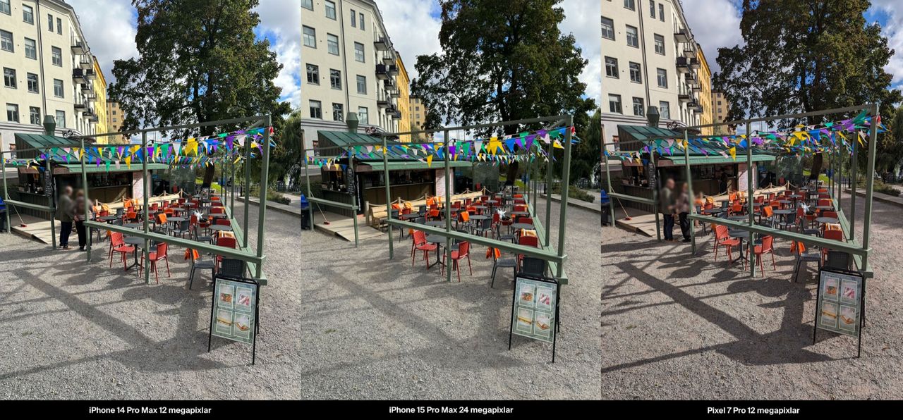 Nu tänker ni att jag har blivit galen och verkligen gått på Apples säljsnack, huvudsensorn är fortfarande på 48 megapixlar som förra året, hur kan det ge fler megapixlar att leka med? Anledningen är att man har ändrat processen när en bild tas. Förra året var i princip alla lägen förutom RAW låsta till 12 megapixlar. Man använde sensorn på 48 megapixlar för att ta en bild som skalades till 12 megapixlar, eller rättare sagt så klumpade man ihop fyra pixlar till en, och sedan processades i en massa steg. Resultatet blev som sagt 12 megapixlar. Detta har man nu ändrat så att man i processen tar en bild på 48 megapixlar och en på 12 megapixlar, där fördelen med att använda den senare är att man kan klumpa ihop fyra pixlar till en och på så vis få in mer ljus. Dessa sätter man sedan ihop och tar det bästa från de två världarna med ljuset från 12 megapixlarna och detaljerna från 48 megapixlarna och detta ger en bild på 24 megapixlar. Resultatet är ironiskt nog inte alltid bättre. Eller det beror på vad man är ute efter och vad man tycker är ”bättre”. - Om man är ute efter en så naturlig bild som möjligt är det bättre. - Om man vill hantera bilden på en dator och verkligen titta på detaljer är det bättre. - Om man bara vill ha en bild som känns ”skön” med lite mer kontrast och skärpa kan det vara sämre. Den spontana reaktionen hos mig är att bilden från iPhone 14 Pro levererar en bild som nog i högre grad kommer att göra ”folket” lyckligare och som nog presterar lite bättre i jämförelser på mobiler mot andra kameror, medan iPhone 15 Pro levererar bild som är mer användbar om man vill justera den i efterhand eller jobba med den på något sätt. Det kan ha att göra med hur vi är vana att se bilder på mobilskärmar också, där hög kontrast och skärpa har varit standard. Kontentan är att det handlar rätt mycket om personliga preferenser och Apple har ställt sig på den naturliga bildens sida. Det går ju att ställa in så att man alltid får bilder med lite mer kontrast om man så vill så det är lösbart, men folk lär ju inte göra det.
