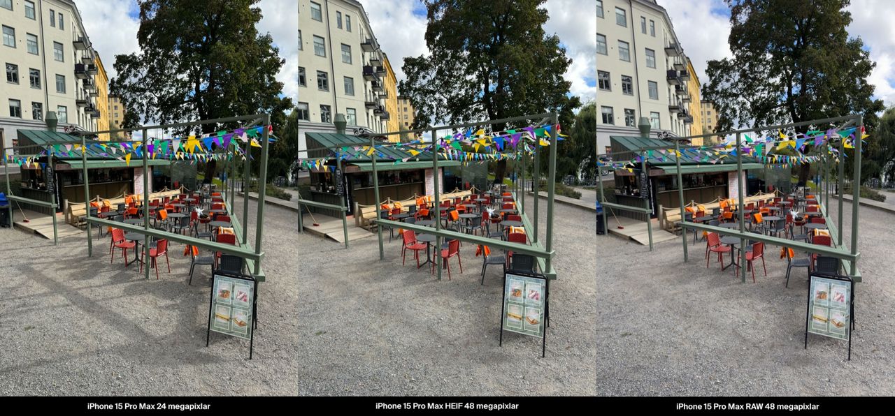 Ville man tidigare få ut en bild på 48 megapixlar var man tvungen att använda ProRaw-läget. Då får man en bild i full upplösning, men också utan komprimering vilket betyder att bilden landar på runt 100 megabyte. Nytt för i år är att man kan välja att få ut en komprimerad bild på 48 megapixlar, då kallas det för HEIF. Den landar på betydligt mer beskedliga 10 megabyte.